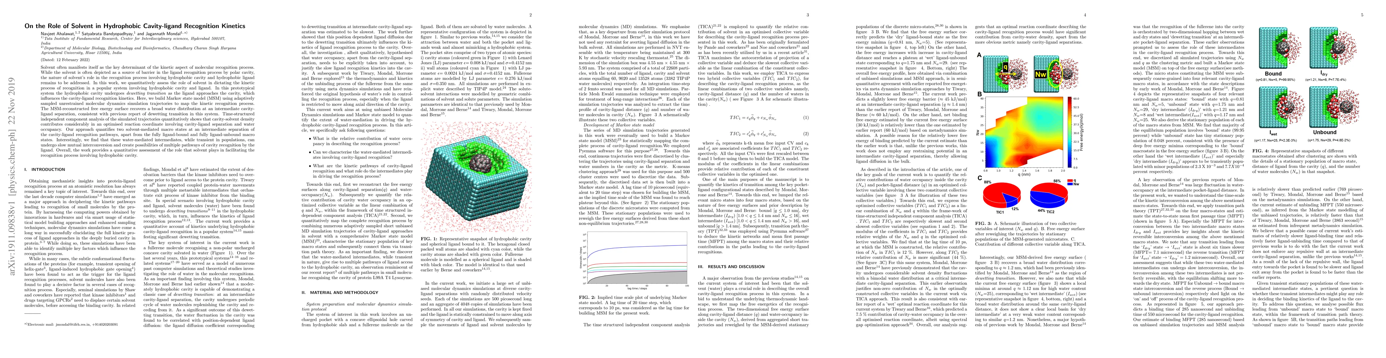 Solvent often manifests itself as the key determinant of the kinetic aspect of molecular recognition process. While the solvent is often depicted as a source of barrier in the ligand recognition process by polar cavity, the nature of solvent's role in the recognition process involving hydrophobic cavity and hydrophobic ligand remains to be addressed. In this work, we quantitatively assess the role of solvent in dictating the kinetic process of recognition in a popular system involving hydrophobic cavity and ligand. In this prototypical system the hydrophobic cavity undergoes \textit{dewetting transition} as the ligand approaches the cavity, which influences the cavity-ligand recognition kinetics. Here, we build Markov state model (MSM) using adaptively sampled unrestrained molecular dynamics simulation trajectories to map the kinetic recognition process. The MSM-reconstructed free energy surface recovers a broad water distribution at an intermediate cavity-ligand separation, consistent with previous report of dewetting transition in this system. Time-structured independent component analysis of the simulated trajectories quantitatively shows that cavity-solvent density contributes considerably in an optimised reaction coordinate involving cavity-ligand separation and water occupancy. Our approach quantifies two solvent-mediated macro states at an intermediate separation of the cavity-ligand recognition pathways, apart from the fully ligand-bound and fully ligand-unbound macro states. Interestingly, we find that these water-mediated intermediates, while transient in populations, can undergo slow mutual interconversion and create possibilities of multiple pathways of cavity recognition by the ligand. Overall, the work provides a quantitative assessment of the role that solvent plays in facilitating the recognition process involving hydrophobic cavity.