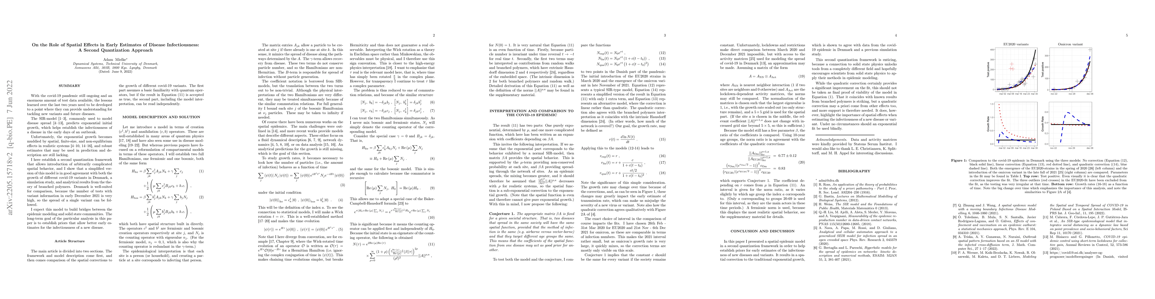 With the covid-19 pandemic still ongoing and an enormous amount of test data available, the lessons learned over the last two years need to be developed to a point where they can provide understanding for tackling new variants and future diseases. The SIR-model commonly used to model disease spread, predicts exponential initial growth, which helps establish the infectiousness of a disease in the early days of an outbreak. Unfortunately, the exponential growth becomes muddied by spatial, finite-size, and non-equilibrium effects in realistic systems, and robust estimates that may be used in prediction and description are still lacking. I here establish a second quantization framework that allows introduction of arbitrarily complicated spatial behavior, and I show that a simplified version of this model is in good agreement with both the growth of different covid-19 variants in Denmark and analytical results from the theory of branched polymers. Denmark is well-suited for comparison, because the number of tests with variant information in early December 2021 is very high, so the spread of a single variant can be followed. I expect this model to build bridges between the epidemic modeling and solid state communities. The long-term goal of the particular analysis in this paper is to establish priors that allow better early estimates for the infectiousness of a new disease.