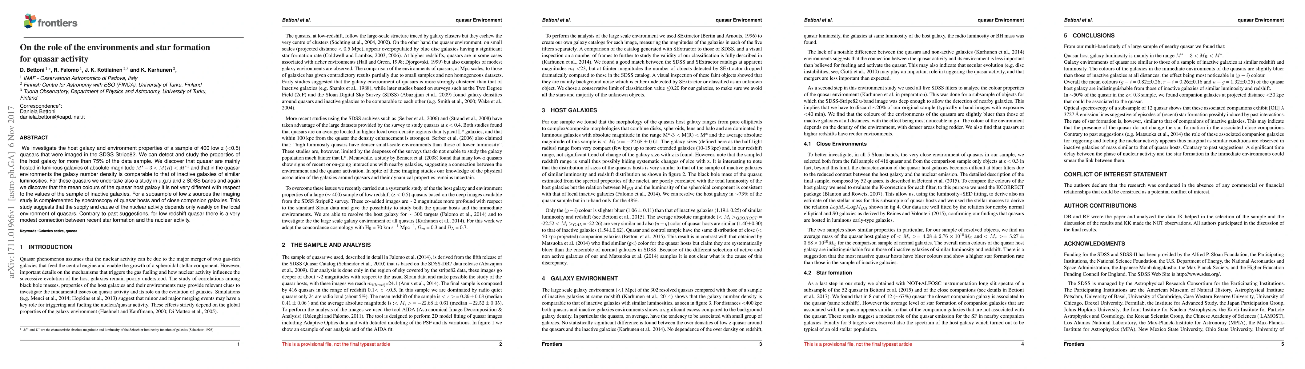 We investigate the host galaxy and environment properties of a sample of 400 low z (<0.5) quasars that were imaged in the SDSS Stripe82. We can detect and study the properties of the host galaxy for more than 75% of the data sample. We discover that quasar are mainly hosted in luminous galaxies of absolute magnitude M* -3 < M(R) < M* and that in the quasar environments the galaxy number density is comparable to that of inactive galaxies of similar luminosities. For these quasars we undertake also a study in u,g,r,i and z SDSS bands and again we discover that the mean colours of the quasar host galaxy it is not very different with respect to the values of the sample of inactive galaxies. For a subsample of low z sources the imaging study is complemented by spectroscopy of quasar hosts and of close companion galaxies. This study suggests that the supply and cause of the nuclear activity depends only weakly on the local environment of quasars. Contrary to past suggestions, for low redshift quasar there is a very modest connection between recent star formation and the nuclear activity.