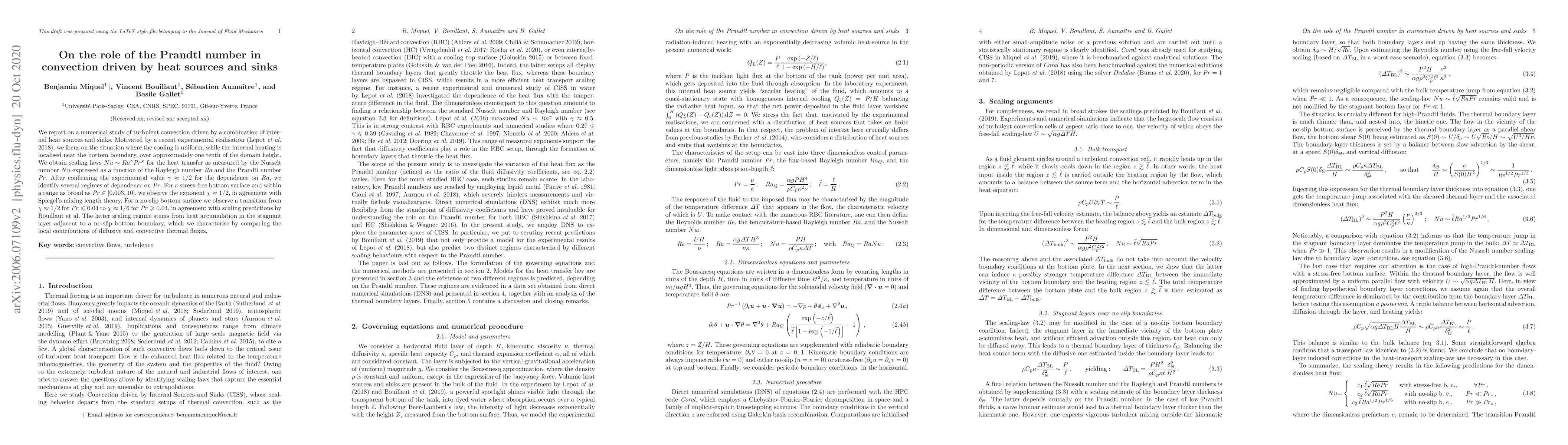 We report on a numerical study of turbulent convection driven by a combination of internal heat sources and sinks. Motivated by a recent experimental realisation (Lepot et al. 2018), we focus on the situation where the cooling is uniform, while the internal heating is localised near the bottom boundary, over approximately one tenth of the domain height. We obtain scaling laws $Nu \sim Ra^\gamma Pr^\chi$ for the heat transfer as measured by the Nusselt number $Nu$ expressed as a function of the Rayleigh number $Ra$ and the Prandtl number $Pr$. After confirming the experimental value $\gamma\approx 1/2$ for the dependence on $Ra$, we identify several regimes of dependence on $Pr$. For a stress-free bottom surface and within a range as broad as $Pr \in [0.003, 10]$, we observe the exponent $\chi\approx 1/2$, in agreement with Spiegel's mixing length theory. For a no-slip bottom surface we observe a transition from $\chi\approx 1/2$ for $Pr \leq 0.04$ to $\chi\approx 1/6$ for $Pr \geq 0.04$, in agreement with scaling predictions by Bouillaut et al. The latter scaling regime stems from heat accumulation in the stagnant layer adjacent to a no-slip bottom boundary, which we characterise by comparing the local contributions of diffusive and convective thermal fluxes.