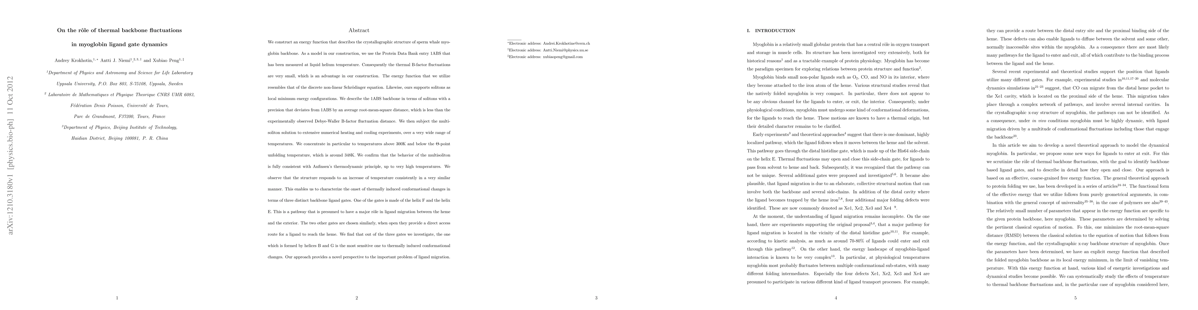 We construct an energy function that describes the crystallographic structure of spermwhale myoglobin backbone. As a model in our construction, we use the Protein Data Bank entry 1ABS that has been measured at liquid helium temperature. Consequently the thermal B-factor fluctuations are very small, which is an advantage in our construction. The energy function that we utilize resembles that of the discrete non-linear Schrodinger equation. Likewise, ours supports solitons as local minimum energy configurations. We describe the 1ABS backbone in terms of solitons with a precision that deviates from 1ABS by an average root-mean-square distance, which is less than the experimentally observed Debye-Waller B-factor fluctuation distance. We then subject the multisoliton solution to extensive numerical heating and cooling experiments, over a very wide range of temperatures. We concentrate in particular to temperatures above 300K and below the theta-point unfolding temperature, which is around 348K. We confirm that the behavior of the multisoliton is fully consistent with Anfinsen's principle, up to very high temperatures. We observe that the structure responds to an increase of temperature consistently in a very similar manner. This enables us to characterize the onset of thermally induced conformational changes in terms of three distinct backbone ligand gates. One of the gates is made of the helix F and the helix E. This is a pathway that is presumed to have a major role in ligand migration between the heme and the exterior. The two other gates are chosen similarly, when open they provide a direct access route for a ligand to reach the heme. We find that out of the three gates we investigate, the one which is formed by helices B and G is the most sensitive one to thermally induced conformational changes. Our approach provides a novel perspective to the important problem of ligand migration.