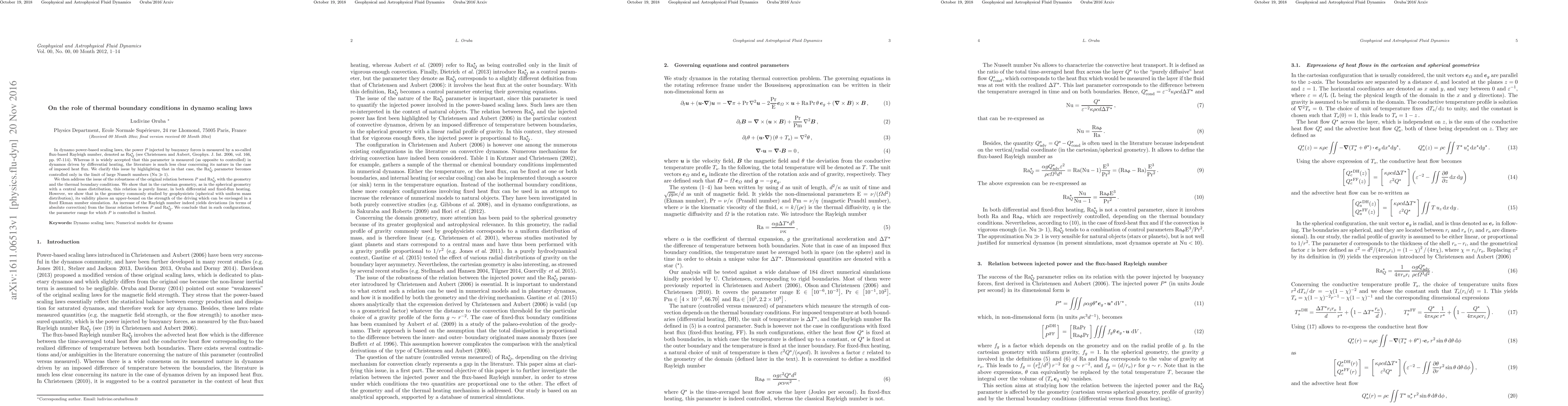 In dynamo power-based scaling laws, the power $P$ injected by buoyancy forces is measured by a so-called flux-based Rayleigh number, denoted as ${\rm Ra}_Q^*$ (see Christensen and Aubert, 2006). Whereas it is widely accepted that this parameter is measured (as opposite to controlled) in dynamos driven by differential heating, the literature is much less clear concerning its nature in the case of imposed heat flux. We clarify this issue by highlighting that in that case, the ${\rm Ra}_{Q}^*$ parameter becomes controlled only in the limit of large Nusselt numbers (${\rm Nu} \gg 1$). We then address the issue of the robustness of the original relation between $P$ and ${\rm Ra}_Q^*$ with the geometry and the thermal boundary conditions. We show that in the cartesian geometry, as in the spherical geometry with a central mass distribution, this relation is purely linear, in both differential and fixed-flux heating. However, we show that in the geometry commonly studied by geophysicists (spherical with uniform mass distribution), its validity places an upper-bound on the strength of the driving which can be envisaged in a fixed Ekman number simulation. An increase of the Rayleigh number indeed yields deviations (in terms of absolute correction) from the linear relation between $P$ and ${\rm Ra}_Q^*$. We conclude that in such configurations, the parameter range for which $P$ is controlled is limited.