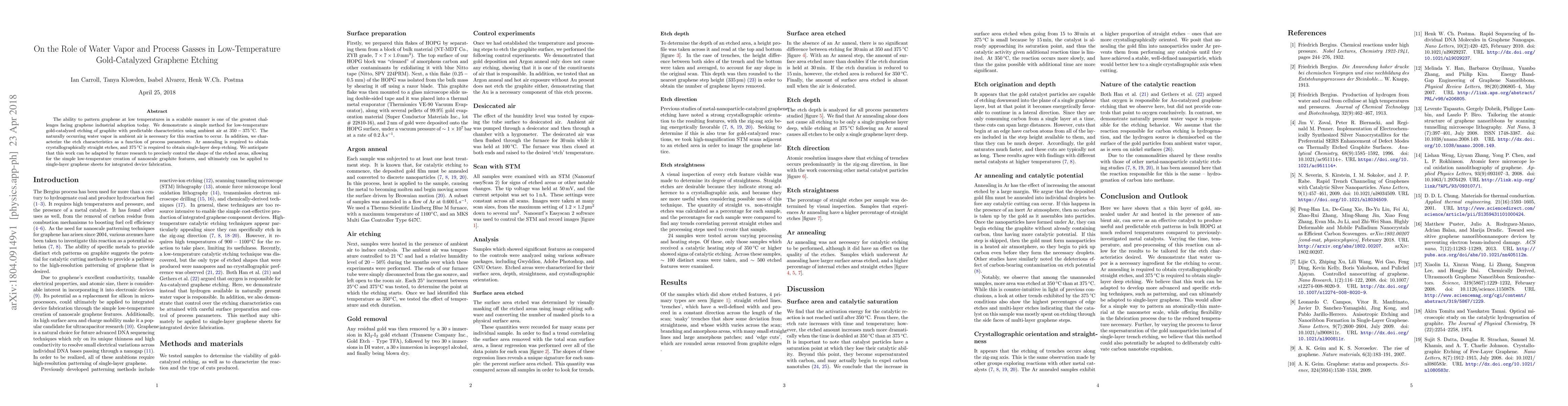 This paper presents a scalable low-temperature method for graphene etching using gold catalysis and ambient air at $350-375^\circ$ C, where water vapor is essential. The study also characterizes the etch process and highlights the need for Ar annealing and $375^\circ$ C for single-layer deep etching.