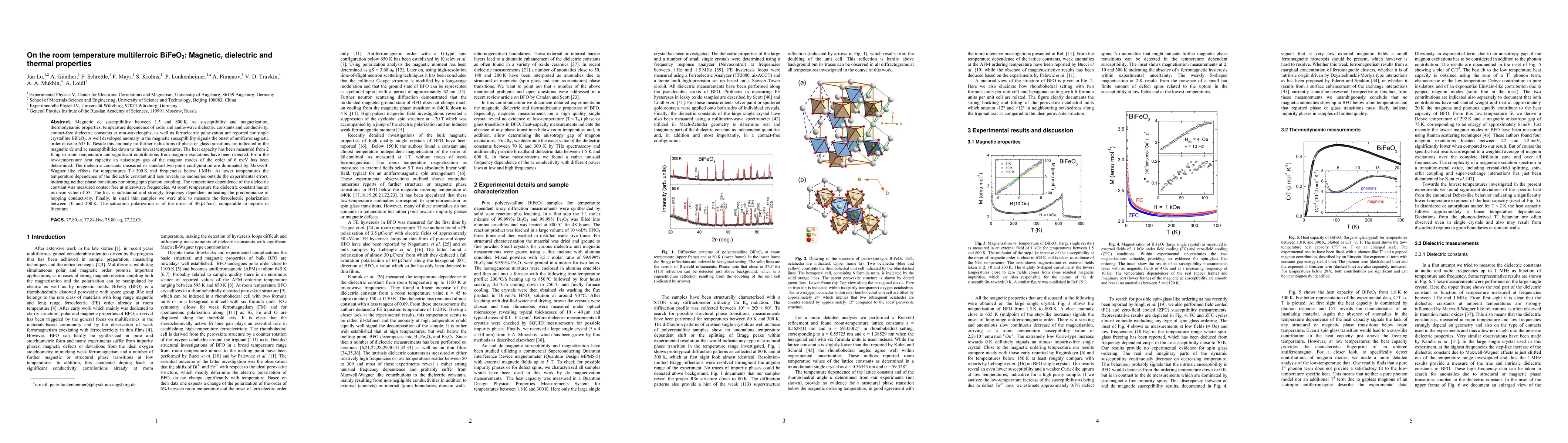Researchers studied BiFeO3 at room temperature, finding it to be a multiferroic material with significant magnetic, dielectric, and thermal properties. Key findings include an antiferromagnetic order at 635 K and substantial ferroelectric polarization.