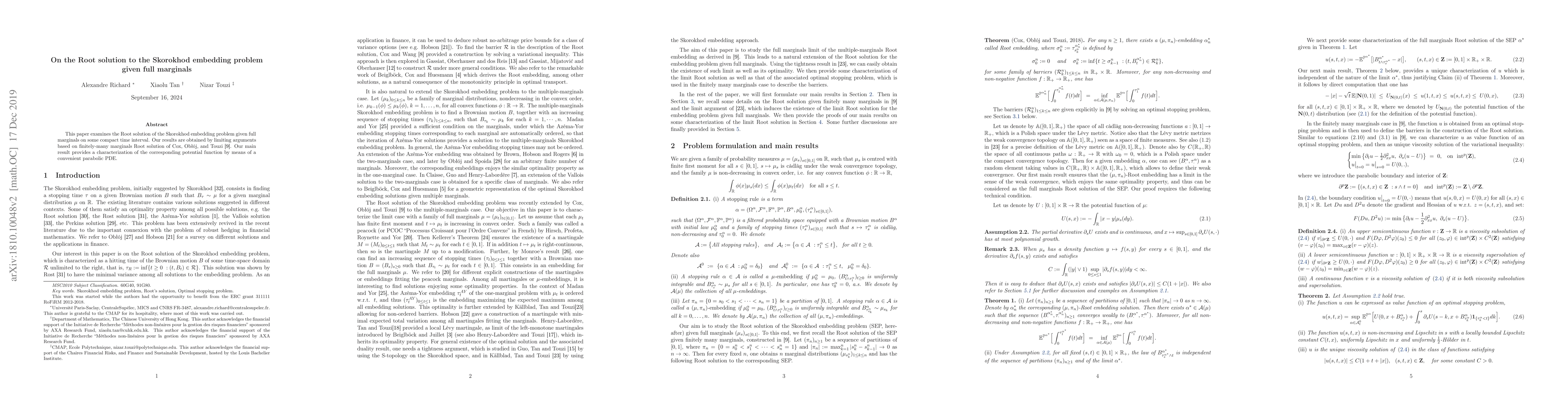 This paper explores the Root solution to the Skorokhod embedding problem with full marginals, utilizing limiting arguments based on finitely-many marginals. The main result characterizes the potential function through a parabolic partial differential equation.