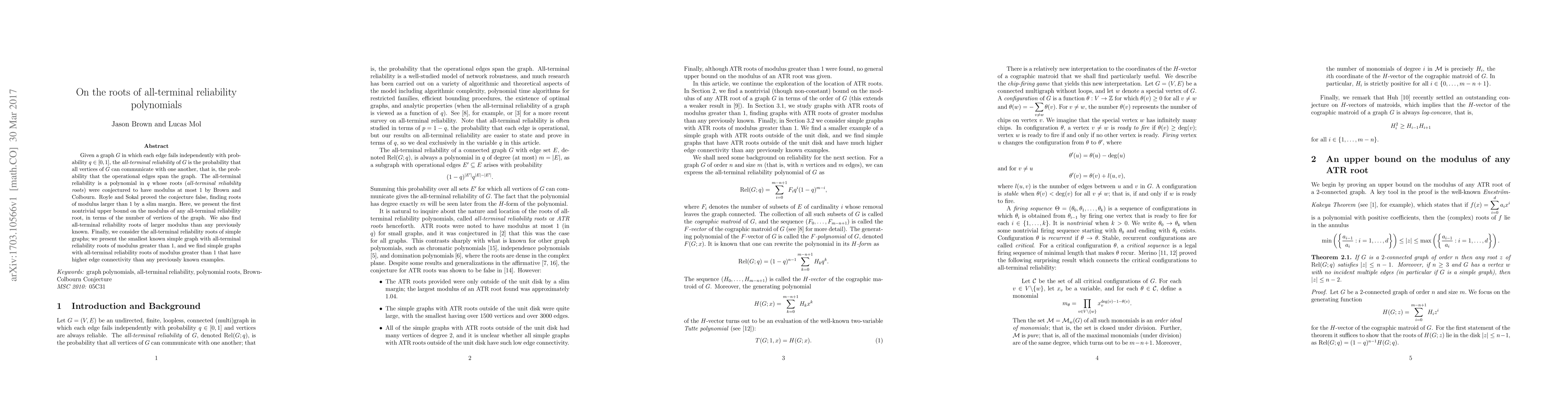 Given a graph $G$ in which each edge fails independently with probability $q\in[0,1],$ the all-terminal reliability of $G$ is the probability that all vertices of $G$ can communicate with one another, that is, the probability that the operational edges span the graph. The all-terminal reliability is a polynomial in $q$ whose roots (all-terminal reliability roots) were conjectured to have modulus at most $1$ by Brown and Colbourn. Royle and Sokal proved the conjecture false, finding roots of modulus larger than $1$ by a slim margin. Here, we present the first nontrivial upper bound on the modulus of any all-terminal reliability root, in terms of the number of vertices of the graph. We also find all-terminal reliability roots of larger modulus than any previously known. Finally, we consider the all-terminal reliability roots of simple graphs; we present the smallest known simple graph with all-terminal reliability roots of modulus greater than $1,$ and we find simple graphs with all-terminal reliability roots of modulus greater than $1$ that have higher edge connectivity than any previously known examples.