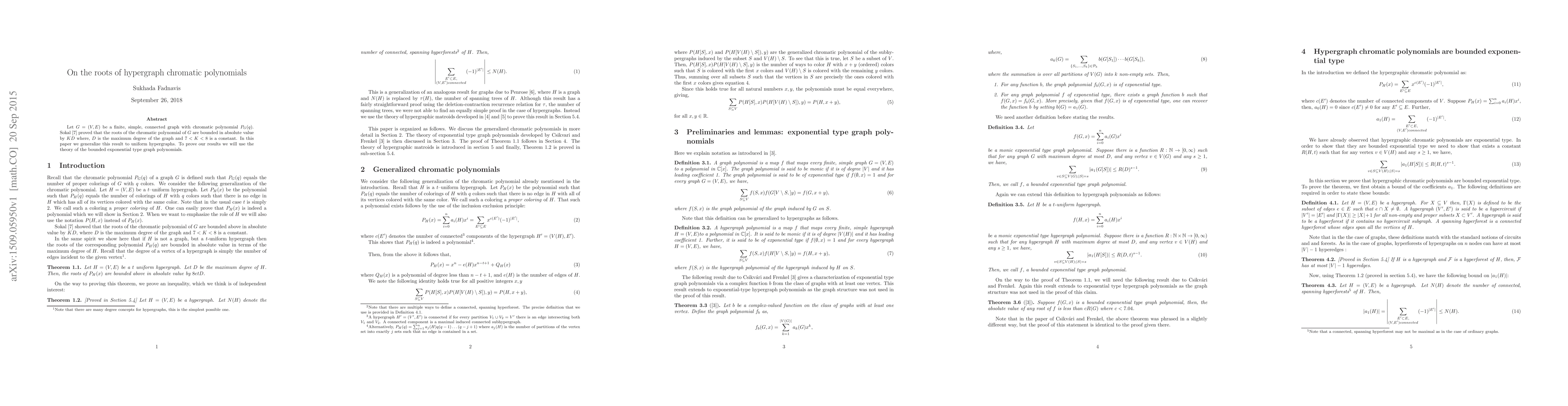 This paper generalizes Sokal's result on the bounds of the roots of chromatic polynomials for graphs to uniform hypergraphs, employing the theory of bounded exponential type graph polynomials. The roots of the hypergraph chromatic polynomial are shown to be bounded in absolute value by a constant multiple of the maximum degree of the hypergraph.