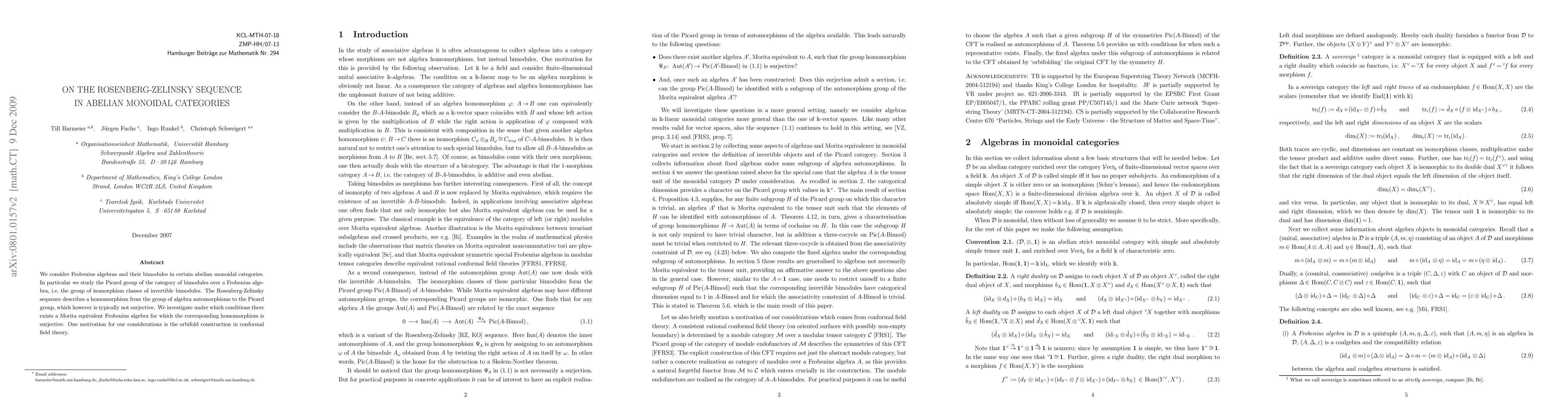 This paper explores Frobenius algebras and their bimodules in abelian monoidal categories, focusing on the Picard group of bimodules over a Frobenius algebra. It investigates conditions under which a Morita equivalent Frobenius algebra can make the Rosenberg-Zelinsky sequence's homomorphism from automorphisms to the Picard group surjective, motivated by orbifold constructions in conformal field theory.