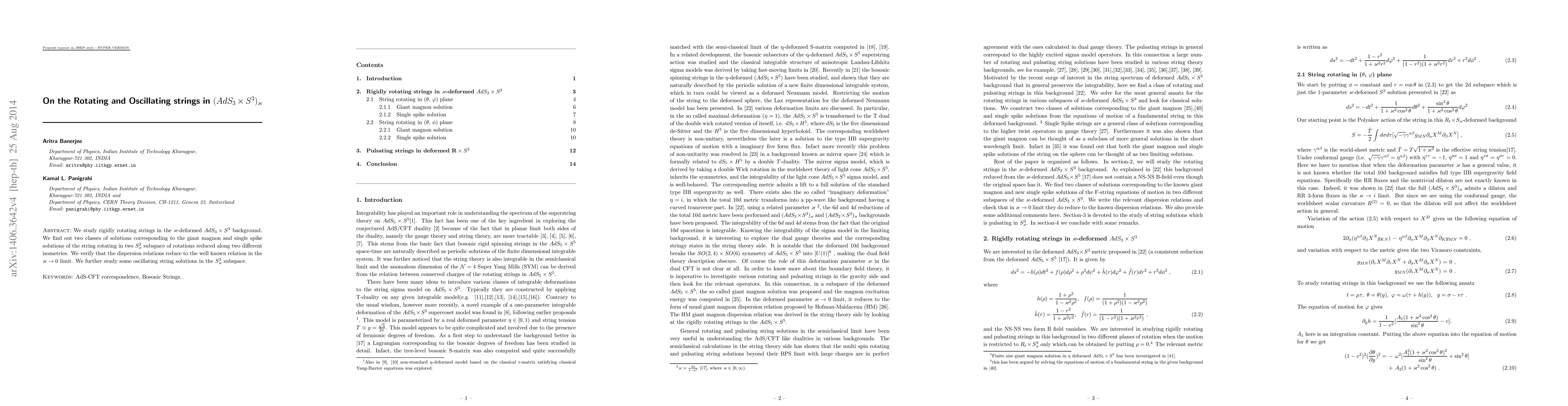This paper investigates rigidly rotating strings in the $\varkappa$-deformed $AdS_3 \times S^3$ background, identifying two solution classes: giant magnon and single spike solutions. It also examines oscillating string solutions in the $S^3_{\varkappa}$ subspace, verifying the known dispersion relation in the $\varkappa \rightarrow 0$ limit.