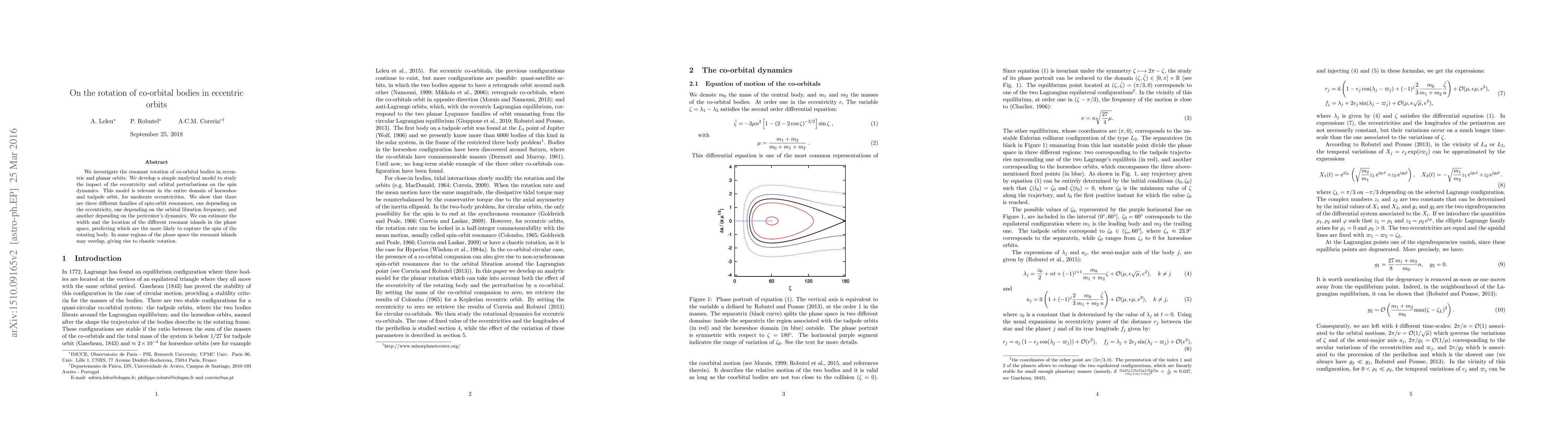This paper develops an analytical model to study the resonant rotation of co-orbital bodies in eccentric orbits, identifying three families of spin-orbit resonances based on eccentricity, orbital libration, and pericenter dynamics. It predicts the likelihood of resonant islands capturing the spin of rotating bodies and identifies regions where chaotic rotation may occur due to overlapping resonant islands.