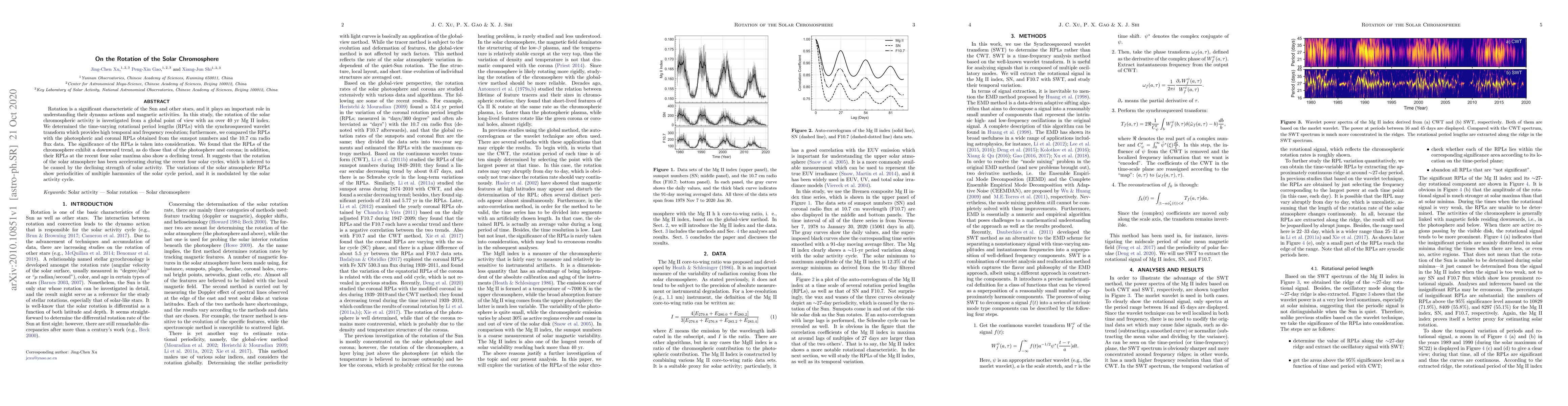 Rotation is a significant characteristic of the Sun and other stars, and it plays an important role in understanding their dynamo actions and magnetic activities. In this study, the rotation of the solar chromospheric activity is investigated from a global point of view with an over 40 yr Mg II index. We determined the time-varying rotational period lengths (RPLs) with the synchrosqueezed wavelet transform which provides high temporal and frequency resolution; furthermore, we compared the RPLs with the photospheric and coronal RPLs obtained from the sunspot numbers and the 10.7 cm radio flux data. The significance of the RPLs is taken into consideration. We found that the RPLs of the chromosphere exhibit a downward trend, as do those that of the photosphere and corona; in addition, their RPLs at the recent four solar maxima also show a declining trend. It suggests that the rotation of the solar atmosphere has been accelerating during the recent four solar cycles, which is inferred to be caused by the declining strength of solar activity. The variations of the solar atmospheric RPLs show periodicities of multiple harmonics of the solar cycle period, and it is modulated by the solar activity cycle.