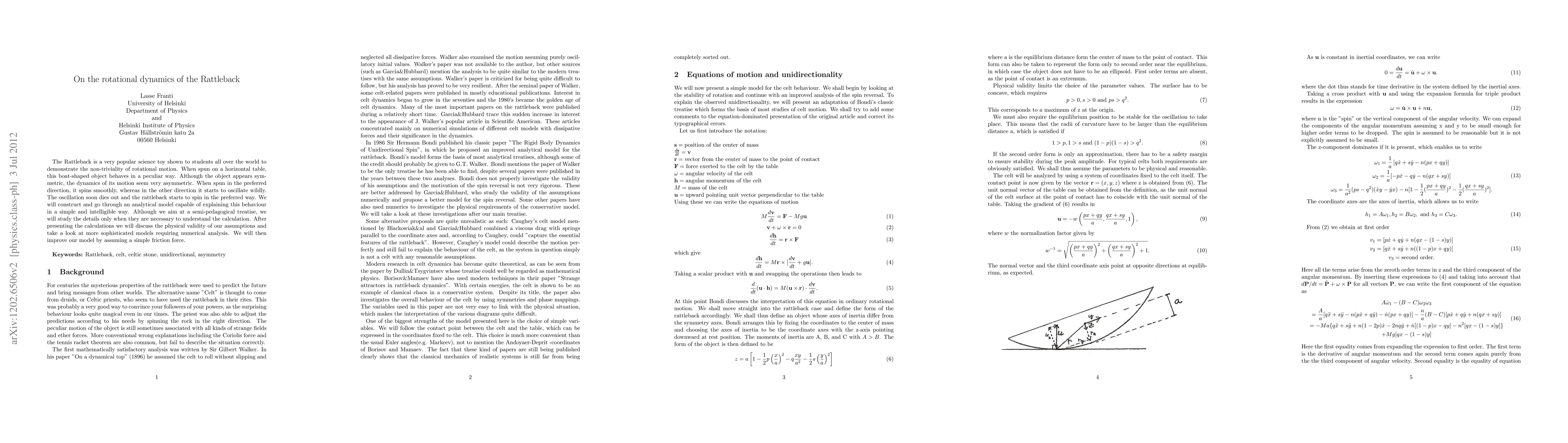 The Rattleback is a very popular science toy shown to students all over the world to demonstrate the non-triviality of rotational motion. When spun on a horizontal table, this boat-shaped object behaves in a peculiar way. Although the object appears symmetric, the dynamics of its motion seem very asymmetric. When spun in the preferred direction, it spins smoothly, whereas in the other direction it starts to oscillate wildly. The oscillation soon dies out and the rattleback starts to spin in the preferred way. We will construct and go through an analytical model capable of explaining this behaviour in a simple and intelligible way. Although we aim at a semi-pedagogical treatise, we will study the details only when they are necessary to understand the calculation. After presenting the calculations we will discuss the physical validity of our assumptions and take a look at more sophisticated models requiring numerical analysis. We will then improve our model by assuming a simple friction force.