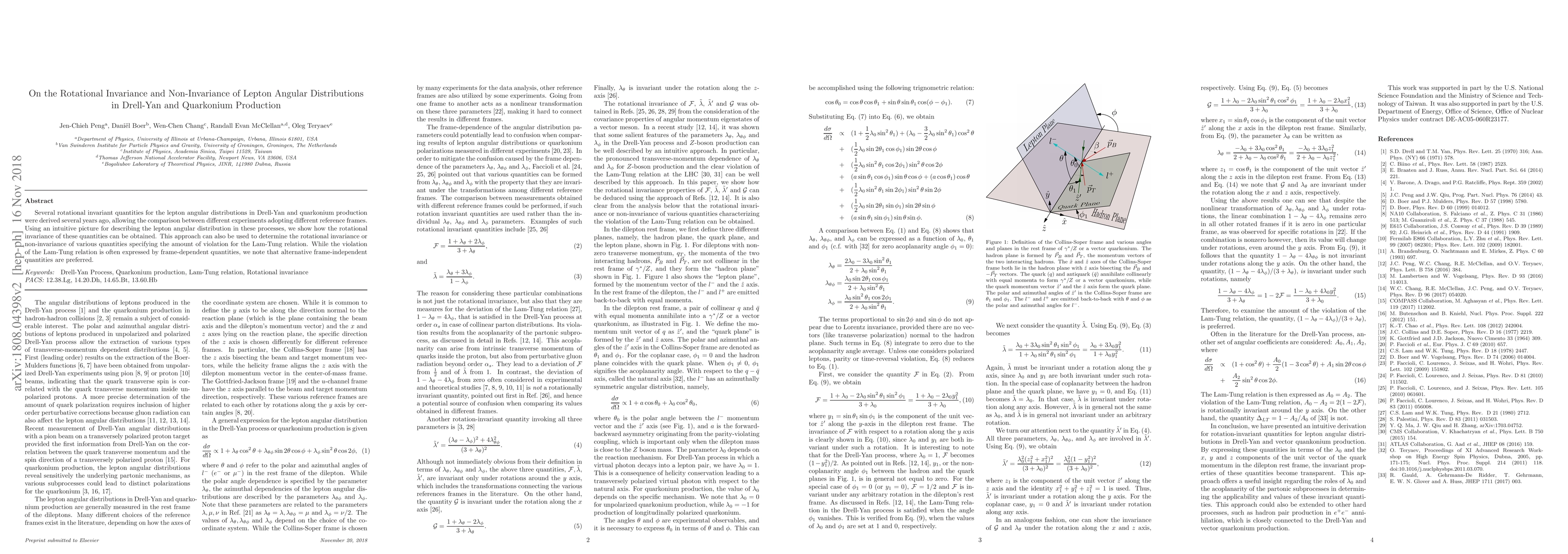 Researchers derived new quantities to measure rotational invariance and non-invariance of lepton angular distributions in particle production, allowing for comparison across different reference frames.