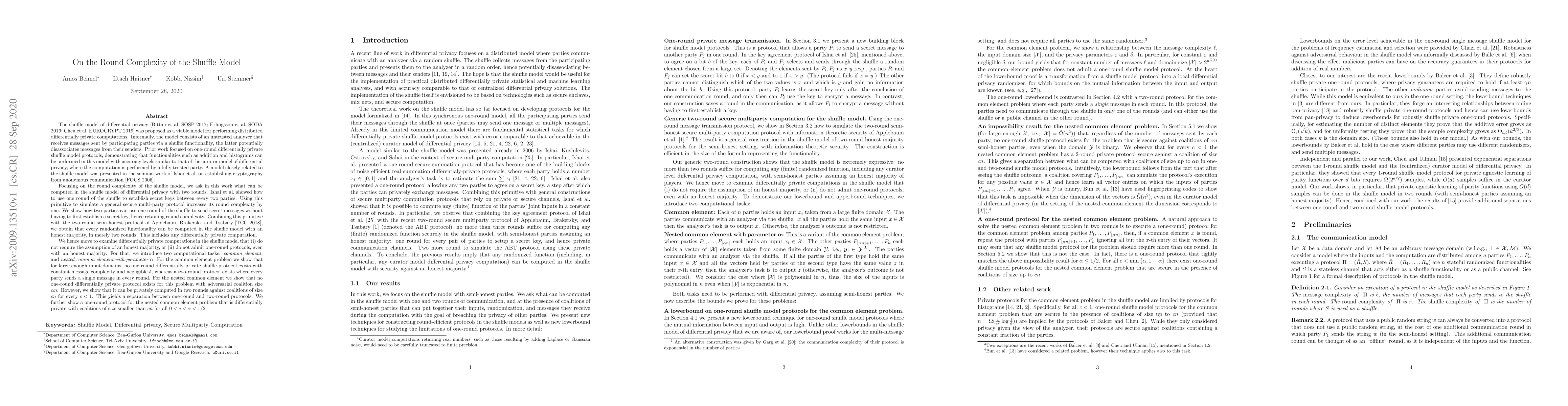 The shuffle model of differential privacy was proposed as a viable model for performing distributed differentially private computations. Informally, the model consists of an untrusted analyzer that receives messages sent by participating parties via a shuffle functionality, the latter potentially disassociates messages from their senders. Prior work focused on one-round differentially private shuffle model protocols, demonstrating that functionalities such as addition and histograms can be performed in this model with accuracy levels similar to that of the curator model of differential privacy, where the computation is performed by a fully trusted party. Focusing on the round complexity of the shuffle model, we ask in this work what can be computed in the shuffle model of differential privacy with two rounds. Ishai et al. [FOCS 2006] showed how to use one round of the shuffle to establish secret keys between every two parties. Using this primitive to simulate a general secure multi-party protocol increases its round complexity by one. We show how two parties can use one round of the shuffle to send secret messages without having to first establish a secret key, hence retaining round complexity. Combining this primitive with the two-round semi-honest protocol of Applebaun et al. [TCC 2018], we obtain that every randomized functionality can be computed in the shuffle model with an honest majority, in merely two rounds. This includes any differentially private computation. We then move to examine differentially private computations in the shuffle model that (i) do not require the assumption of an honest majority, or (ii) do not admit one-round protocols, even with an honest majority. For that, we introduce two computational tasks: the common-element problem and the nested-common-element problem, for which we show separations between one-round and two-round protocols.