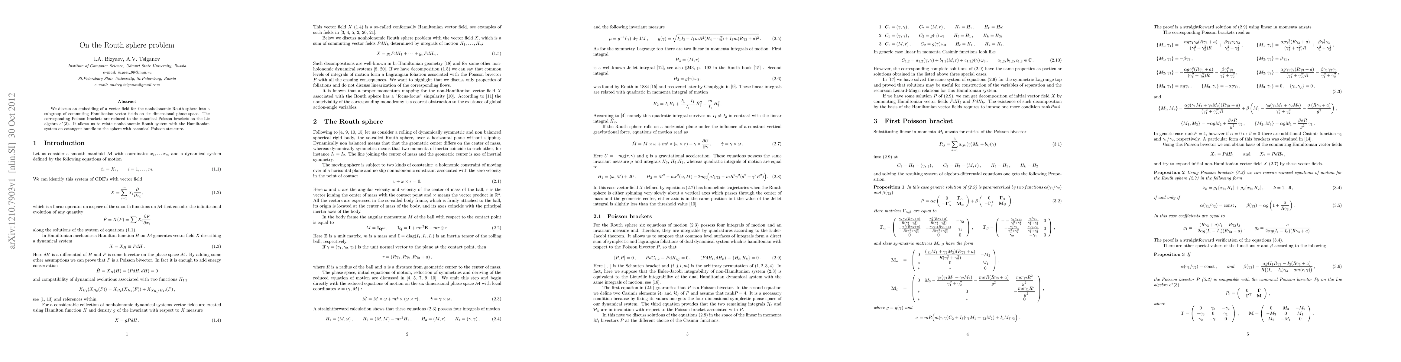We discuss an embedding of a vector field for the nonholonomic Routh sphere into a subgroup of commuting Hamiltonian vector fields on six dimensional phase space. The corresponding Poisson brackets are reduced to the canonical Poisson brackets on the Lie algebra e(3). It allows us to relate nonholonomic Routh system with the Hamiltonian system on cotangent bundle to the sphere with canonical Poisson structure.