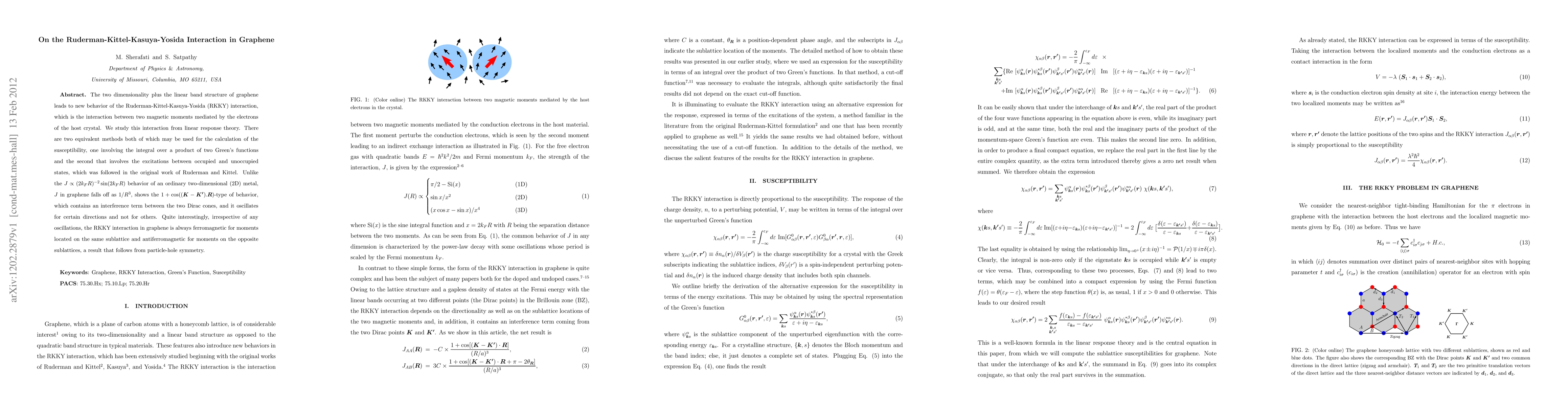 The study explores the unique Ruderman-Kittel-Kasuya-Yosida (RKKY) interaction in graphene, revealing a $1/R^3$ decay instead of the typical $1/R^2$ in 2D metals, due to its linear band structure. The RKKY interaction in graphene always exhibits ferromagnetic behavior within the same sublattice and antiferromagnetic between opposite sublattices, owing to particle-hole symmetry.