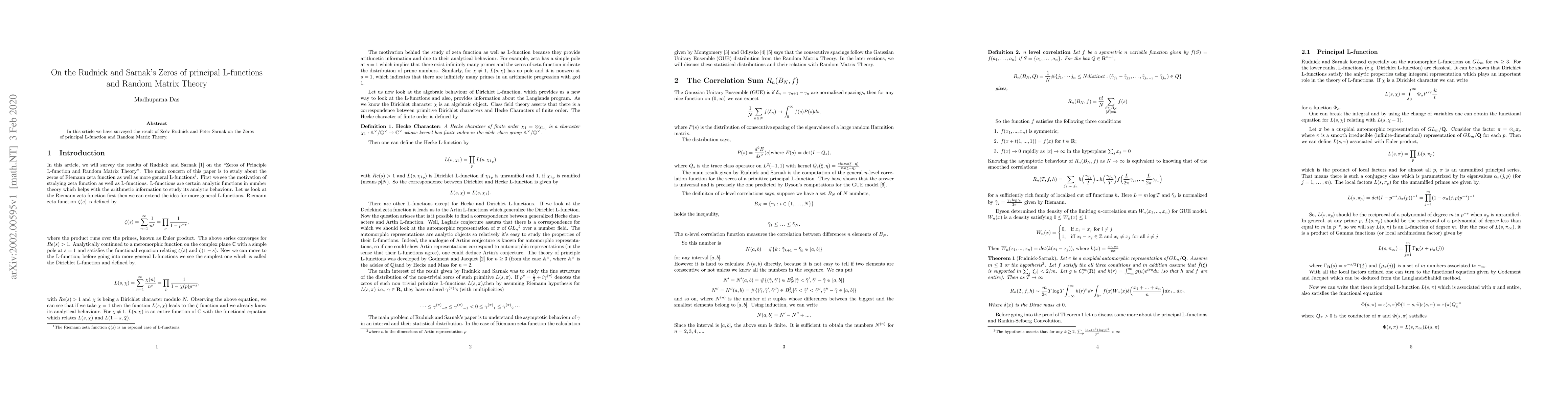 In this article, we have surveyed the result of Ze\'ev Rudnick and Peter Sarnak on the Zeros of principal L-function and Random Matrix Theory