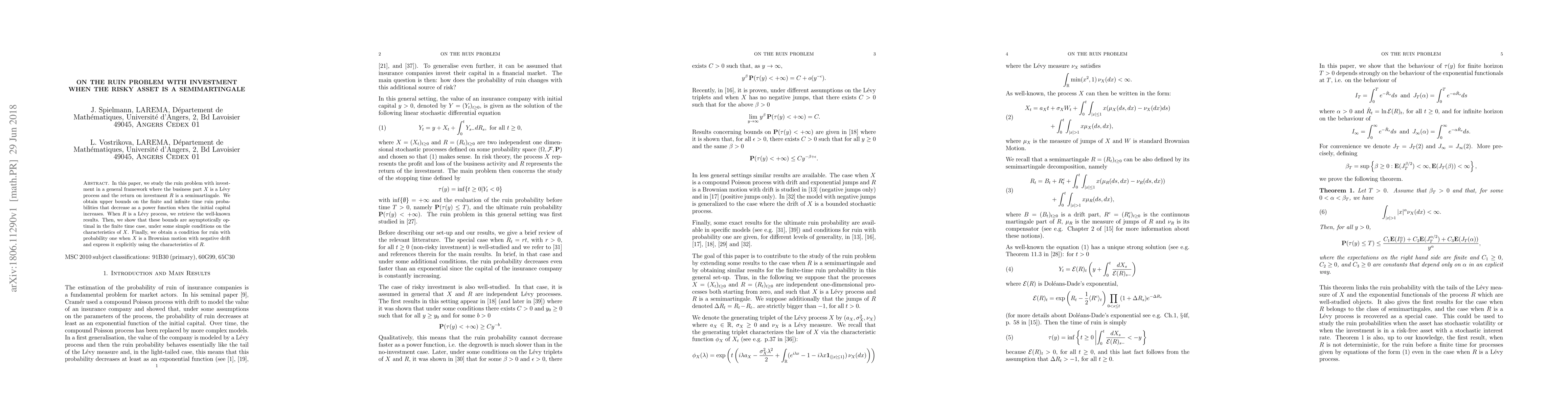 In this paper, we study the ruin problem with investment in a general framework where the business part X is a L{\'e}vy process and the return on investment R is a semimartingale. We obtain upper bounds on the finite and infinite time ruin probabilities that decrease as a power function when the initial capital increases. When R is a L{\'e}vy process, we retrieve the well-known results. Then, we show that these bounds are asymptotically optimal in the finite time case, under some simple conditions on the characteristics of X. Finally, we obtain a condition for ruin with probability one when X is a Brownian motion with negative drift and express it explicitly using the characteristics of R.