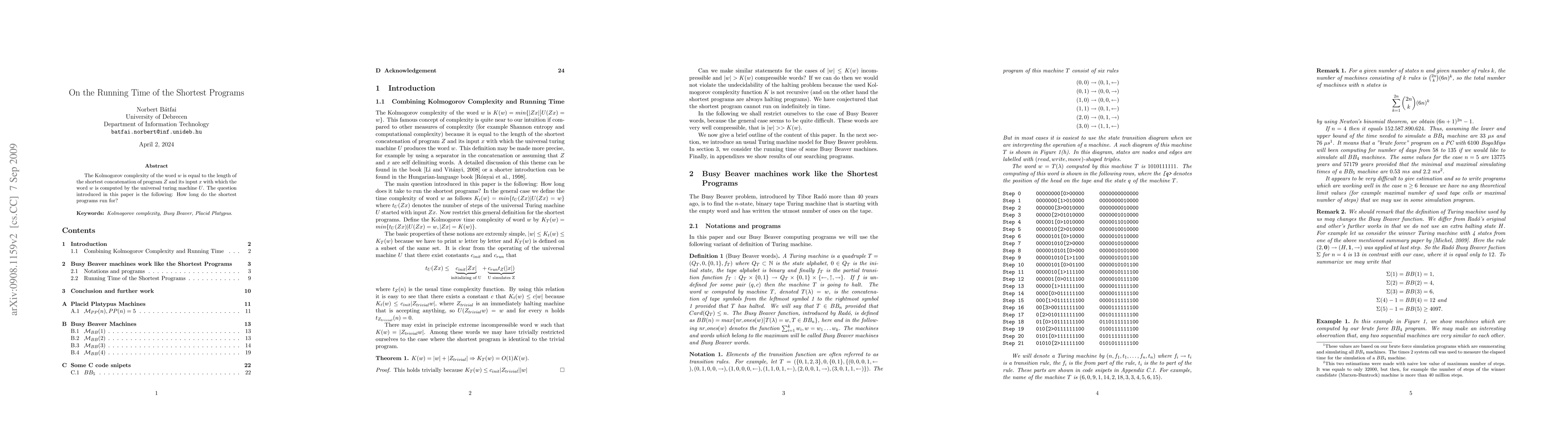 The Kolmogorov complexity of the word w is equal to the length of the shortest concatenation of program Z and its input x with which the word w is computed by the universal turing machine U. The question introduced in this paper is the following: How long do the shortest programs run for?