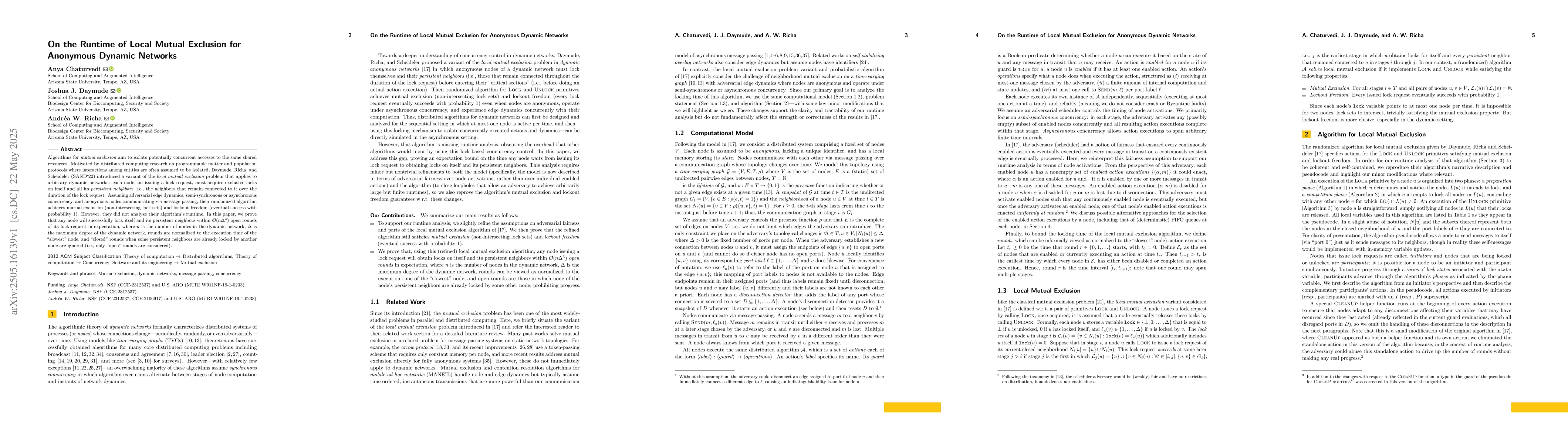 The research builds upon Daymude, Richa, and Scheideler's (SAND'22) local mutual exclusion algorithm for anonymous dynamic networks, analyzing its runtime under adversarial edge dynamics, semi-synchronous or asynchronous concurrency, and message-passing communication.