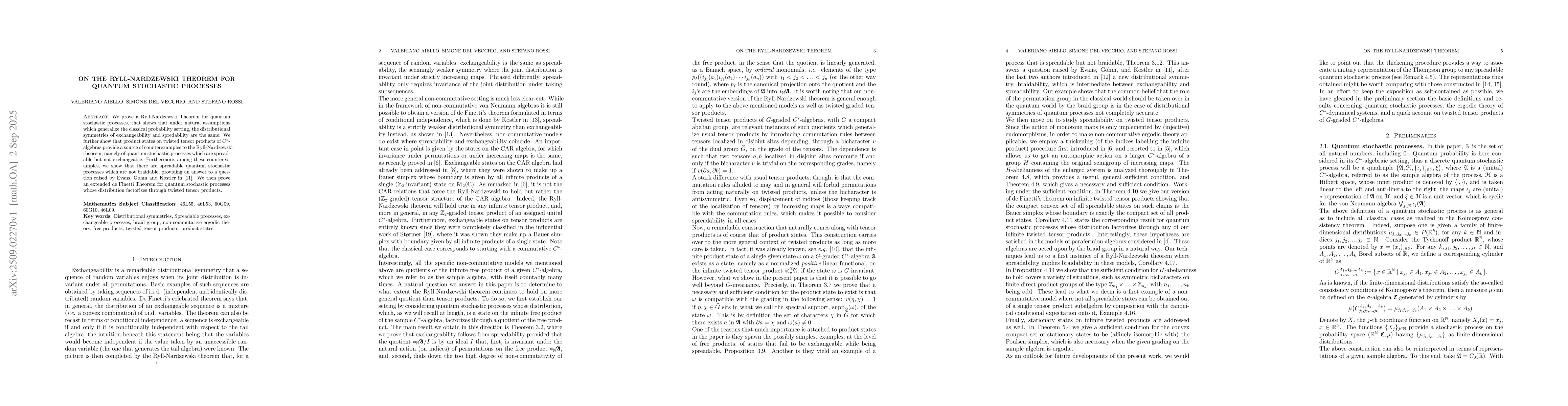 We prove a Ryll-Nardzewski Theorem for quantum stochastic processes, that shows that under natural assumptions which generalize the classical probability setting, the distributional symmetries of exchangeability and spredability are the same. We further show that product states on twisted tensor products of C ^*- algebras provide a source of counterexamples to the Ryll-Nardzewski theorem, namely of quantum stochastic processes which are spreadable but not exchangeable. Furthermore, among these counterexamples, we show that there are spreadable quantum stochastic processes which are not braidable, providing an answer to a question raised by Evans, Gohm and Kostler in [11]. We then prove an extended de Finetti Theorem for quantum stochastic processes whose distribution factorizes through twisted tensor products.