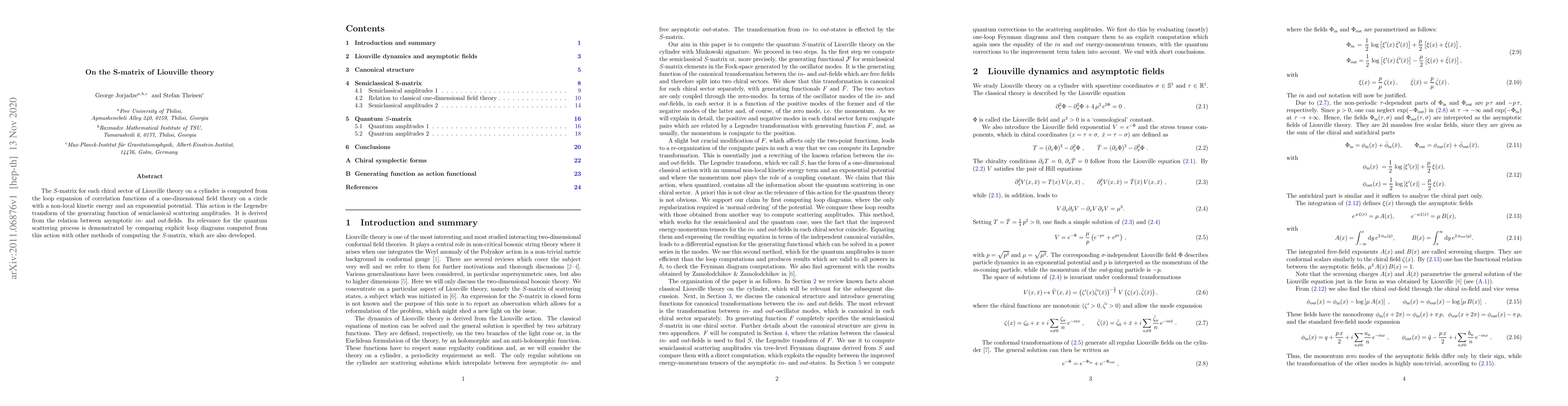 The S-matrix for each chiral sector of Liouville theory on a cylinder is computed from the loop expansion of correlation functions of a one-dimensional field theory on a circle with a non-local kinetic energy and an exponential potential. This action is the Legendre transform of the generating function of semiclassical scattering amplitudes. It is derived from the relation between asymptotic in- and out-fields. Its relevance for the quantum scattering process is demonstrated by comparing explicit loop diagrams computed from this action with other methods of computing the S-matrix, which are also developed.