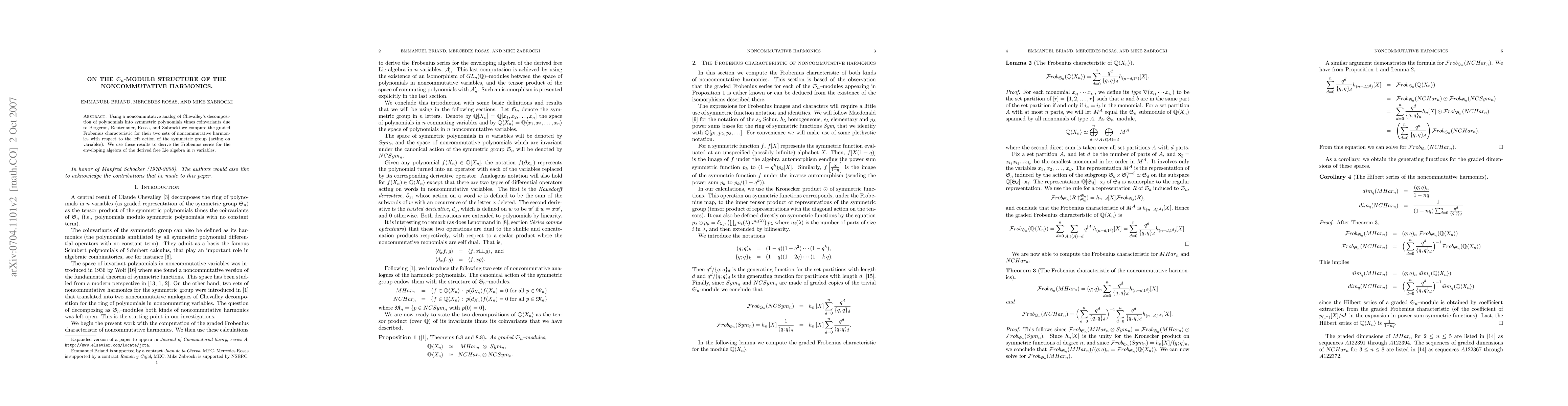 Using a noncommutative analog of Chevalley's decomposition of polynomials into symmetric polynomials times coinvariants due to Bergeron, Reutenauer, Rosas, and Zabrocki we compute the graded Frobenius series for their two sets of noncommutative harmonics with respect to the left action of the symmetric group (acting on variables). We use these results to derive the Frobenius series for the enveloping algebra of the derived free Lie algebra in n variables.