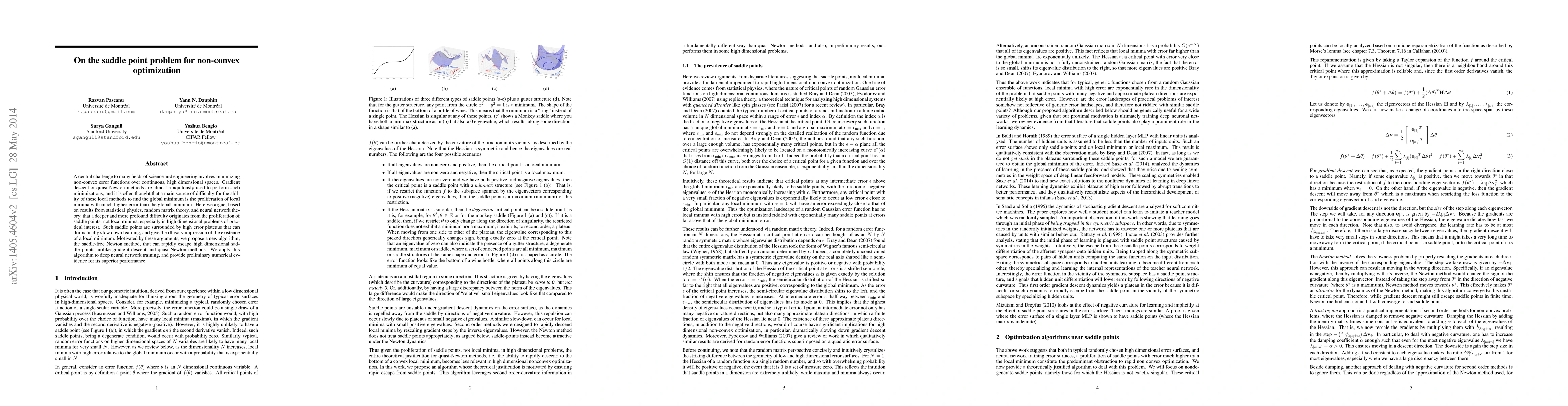A central challenge to many fields of science and engineering involves minimizing non-convex error functions over continuous, high dimensional spaces. Gradient descent or quasi-Newton methods are almost ubiquitously used to perform such minimizations, and it is often thought that a main source of difficulty for the ability of these local methods to find the global minimum is the proliferation of local minima with much higher error than the global minimum. Here we argue, based on results from statistical physics, random matrix theory, and neural network theory, that a deeper and more profound difficulty originates from the proliferation of saddle points, not local minima, especially in high dimensional problems of practical interest. Such saddle points are surrounded by high error plateaus that can dramatically slow down learning, and give the illusory impression of the existence of a local minimum. Motivated by these arguments, we propose a new algorithm, the saddle-free Newton method, that can rapidly escape high dimensional saddle points, unlike gradient descent and quasi-Newton methods. We apply this algorithm to deep neural network training, and provide preliminary numerical evidence for its superior performance.