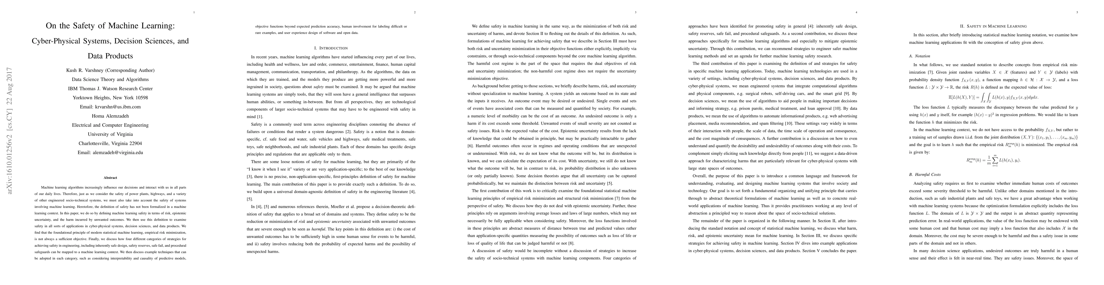 This paper formalizes the concept of machine learning safety in terms of risk, epistemic uncertainty, and harm from unwanted outcomes, and applies this definition to various applications in cyber-physical systems, decision sciences, and data products. It also explores how traditional engineering safety strategies can be adapted to machine learning, including inherently safe design and procedural safeguards.