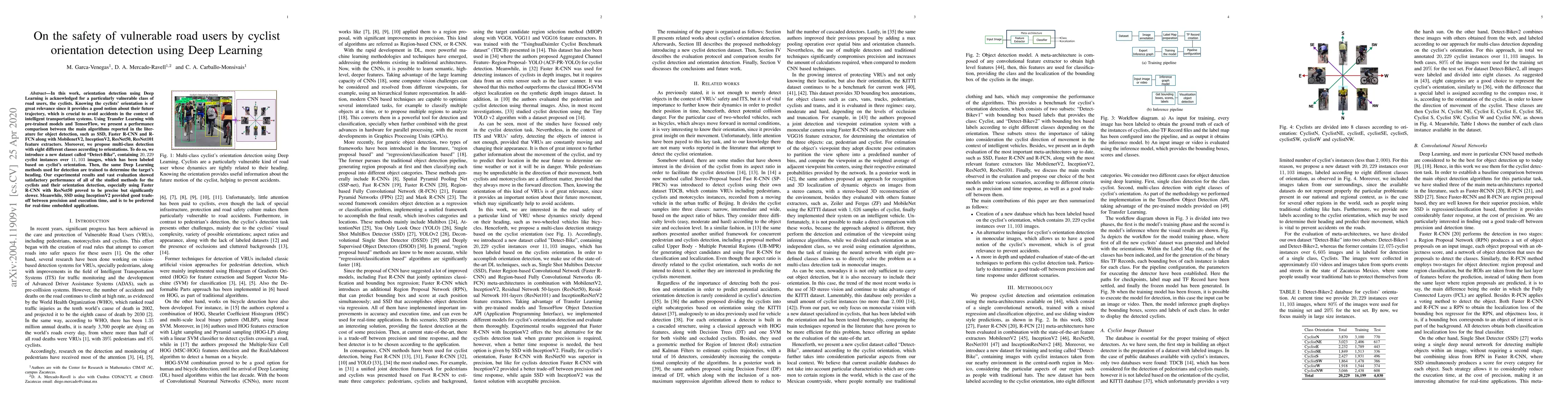 In this work, orientation detection using Deep Learning is acknowledged for a particularly vulnerable class of road users,the cyclists. Knowing the cyclists' orientation is of great relevance since it provides a good notion about their future trajectory, which is crucial to avoid accidents in the context of intelligent transportation systems. Using Transfer Learning with pre-trained models and TensorFlow, we present a performance comparison between the main algorithms reported in the literature for object detection,such as SSD, Faster R-CNN and R-FCN along with MobilenetV2, InceptionV2, ResNet50, ResNet101 feature extractors. Moreover, we propose multi-class detection with eight different classes according to orientations. To do so, we introduce a new dataset called "Detect-Bike", containing 20,229 cyclist instances over 11,103 images, which has been labeled based on cyclist's orientation. Then, the same Deep Learning methods used for detection are trained to determine the target's heading. Our experimental results and vast evaluation showed satisfactory performance of all of the studied methods for the cyclists and their orientation detection, especially using Faster R-CNN with ResNet50 proved to be precise but significantly slower. Meanwhile, SSD using InceptionV2 provided good trade-off between precision and execution time, and is to be preferred for real-time embedded applications.