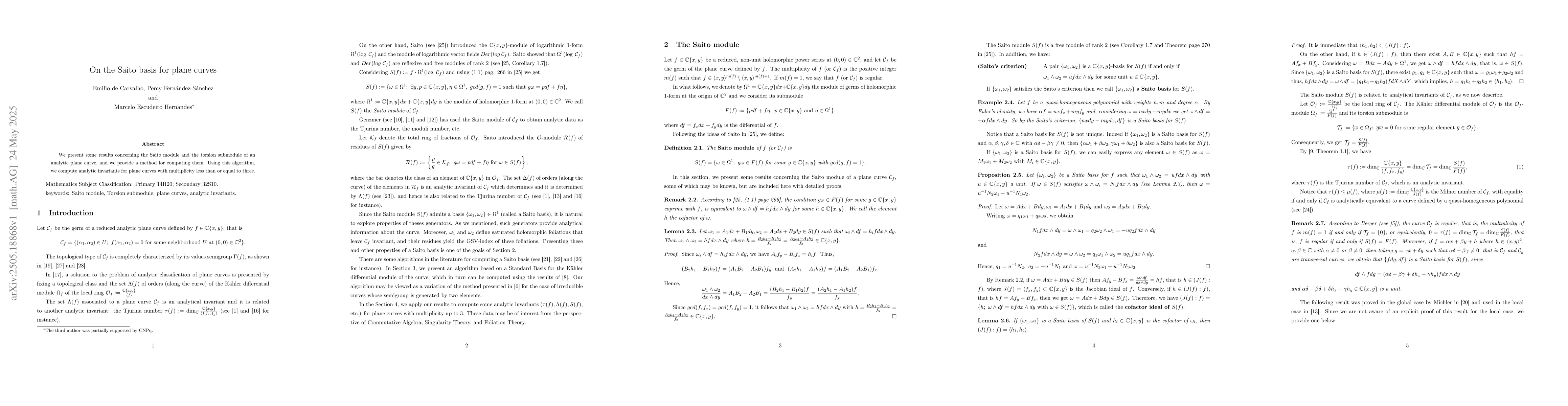 The introduction of an efficient algorithm for calculating the Saito module and torsion submodule, along with their application in computing analytic invariants for low-multiplicity plane curves.
