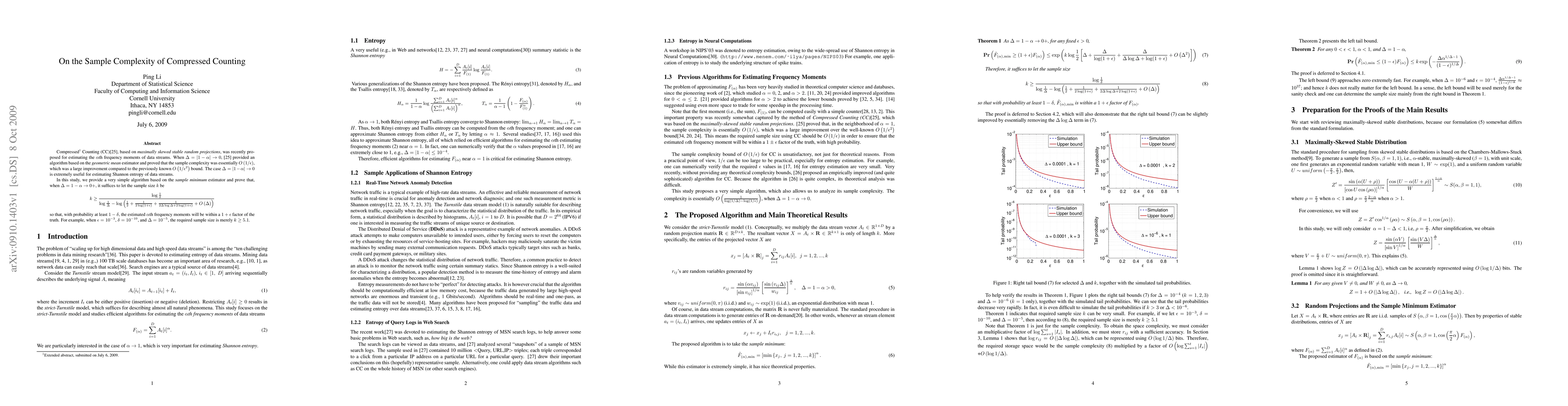 This paper proposes a simple algorithm for estimating the Shannon entropy of data streams using Compressed Counting (CC) and demonstrates a significantly improved sample complexity bound compared to previous methods.