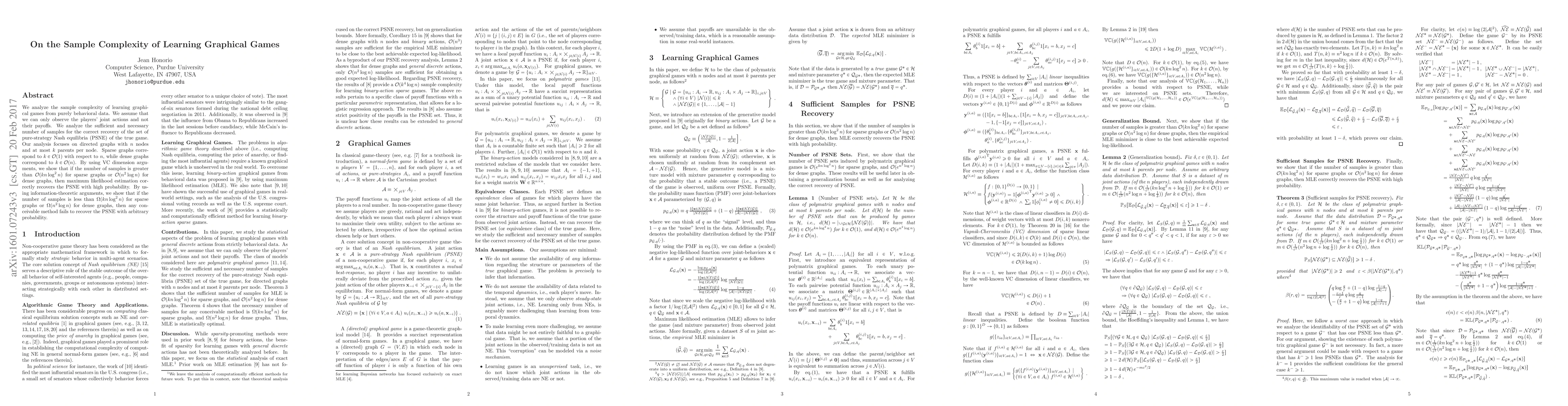 We analyze the sample complexity of learning graphical games from purely behavioral data. We assume that we can only observe the players' joint actions and not their payoffs. We analyze the sufficient and necessary number of samples for the correct recovery of the set of pure-strategy Nash equilibria (PSNE) of the true game. Our analysis focuses on directed graphs with $n$ nodes and at most $k$ parents per node. Sparse graphs correspond to ${k \in O(1)}$ with respect to $n$, while dense graphs correspond to ${k \in O(n)}$. By using VC dimension arguments, we show that if the number of samples is greater than ${O(k n \log^2{n})}$ for sparse graphs or ${O(n^2 \log{n})}$ for dense graphs, then maximum likelihood estimation correctly recovers the PSNE with high probability. By using information-theoretic arguments, we show that if the number of samples is less than ${\Omega(k n \log^2{n})}$ for sparse graphs or ${\Omega(n^2 \log{n})}$ for dense graphs, then any conceivable method fails to recover the PSNE with arbitrary probability.