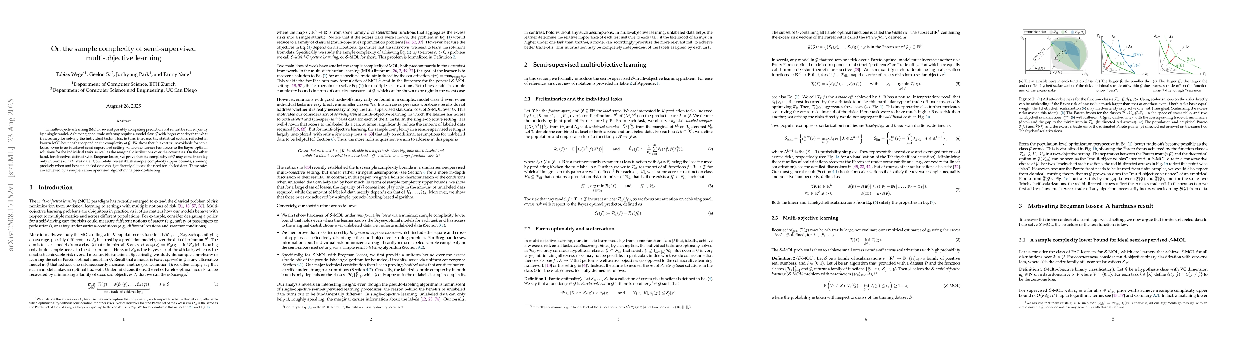In multi-objective learning (MOL), several possibly competing prediction tasks must be solved jointly by a single model. Achieving good trade-offs may require a model class $\mathcal{G}$ with larger capacity than what is necessary for solving the individual tasks. This, in turn, increases the statistical cost, as reflected in known MOL bounds that depend on the complexity of $\mathcal{G}$. We show that this cost is unavoidable for some losses, even in an idealized semi-supervised setting, where the learner has access to the Bayes-optimal solutions for the individual tasks as well as the marginal distributions over the covariates. On the other hand, for objectives defined with Bregman losses, we prove that the complexity of $\mathcal{G}$ may come into play only in terms of unlabeled data. Concretely, we establish sample complexity upper bounds, showing precisely when and how unlabeled data can significantly alleviate the need for labeled data. These rates are achieved by a simple, semi-supervised algorithm via pseudo-labeling.