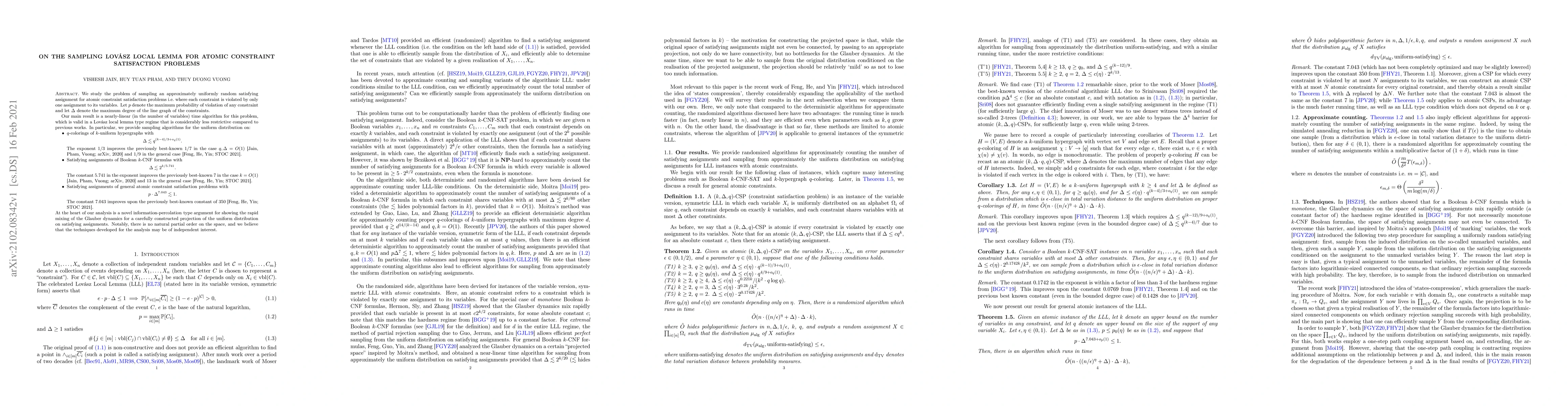 We study the problem of sampling an approximately uniformly random satisfying assignment for atomic constraint satisfaction problems i.e. where each constraint is violated by only one assignment to its variables. Let $p$ denote the maximum probability of violation of any constraint and let $\Delta$ denote the maximum degree of the line graph of the constraints. Our main result is a nearly-linear (in the number of variables) time algorithm for this problem, which is valid in a Lov\'asz local lemma type regime that is considerably less restrictive compared to previous works. In particular, we provide sampling algorithms for the uniform distribution on: (1) $q$-colorings of $k$-uniform hypergraphs with $\Delta \lesssim q^{(k-4)/3 + o_{q}(1)}.$ The exponent $1/3$ improves the previously best-known $1/7$ in the case $q, \Delta = O(1)$ [Jain, Pham, Vuong; arXiv, 2020] and $1/9$ in the general case [Feng, He, Yin; STOC 2021]. (2) Satisfying assignments of Boolean $k$-CNF formulas with $\Delta \lesssim 2^{k/5.741}.$ The constant $5.741$ in the exponent improves the previously best-known $7$ in the case $k = O(1)$ [Jain, Pham, Vuong; arXiv, 2020] and $13$ in the general case [Feng, He, Yin; STOC 2021]. (3) Satisfying assignments of general atomic constraint satisfaction problems with $p\cdot \Delta^{7.043} \lesssim 1.$ The constant $7.043$ improves upon the previously best-known constant of $350$ [Feng, He, Yin; STOC 2021]. At the heart of our analysis is a novel information-percolation type argument for showing the rapid mixing of the Glauber dynamics for a carefully constructed projection of the uniform distribution on satisfying assignments. Notably, there is no natural partial order on the space, and we believe that the techniques developed for the analysis may be of independent interest.