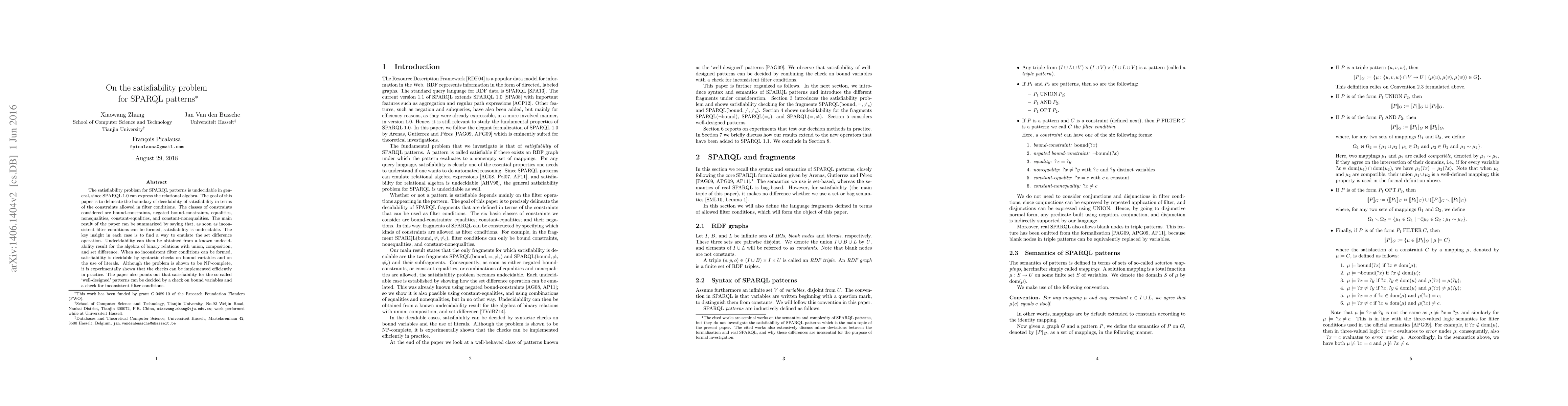 This paper explores the decidability of satisfiability for SPARQL patterns, showing that it is undecidable when inconsistent filter conditions are possible due to emulating set difference operations. When such conditions are avoided, satisfiability can be efficiently decided through simple checks on bound variables and literals.