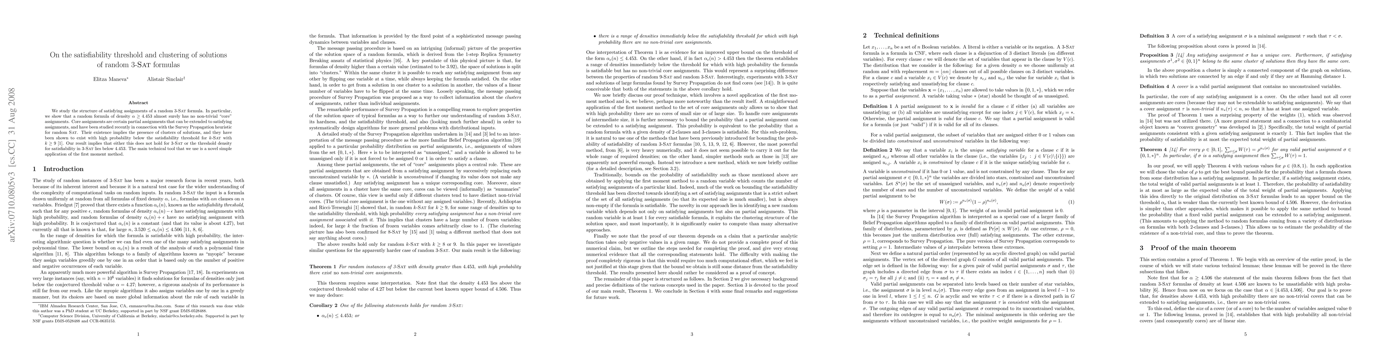 This paper investigates the structure of satisfying assignments in random 3-SAT formulas, revealing that formulas with a density of 4.453 or higher almost surely lack non-trivial "core" assignments, which would otherwise imply the existence of solution clusters. The study uses a novel application of the first moment method to reach this conclusion.