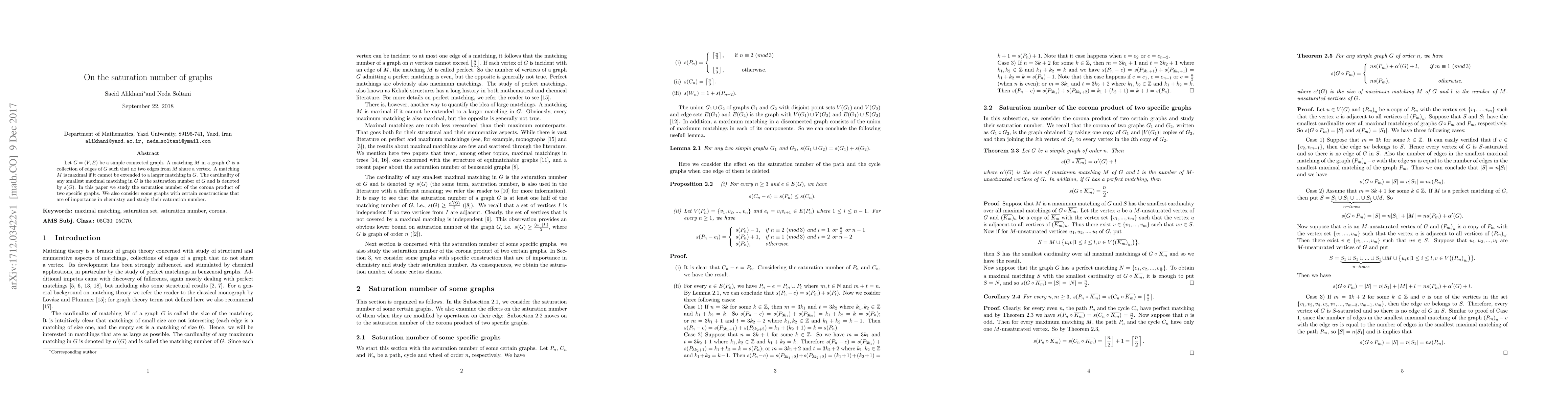 Let $G=(V,E)$ be a simple connected graph. A matching $M$ in a graph $G$ is a collection of edges of $G$ such that no two edges from $M$ share a vertex. A matching $M$ is maximal if it cannot be extended to a larger matching in $G$. The cardinality of any smallest maximal matching in $G$ is the saturation number of $G$ and is denoted by $s(G)$. In this paper we study the saturation number of the corona product of two specific graphs. We also consider some graphs with certain constructions that are of importance in chemistry and study their saturation number.