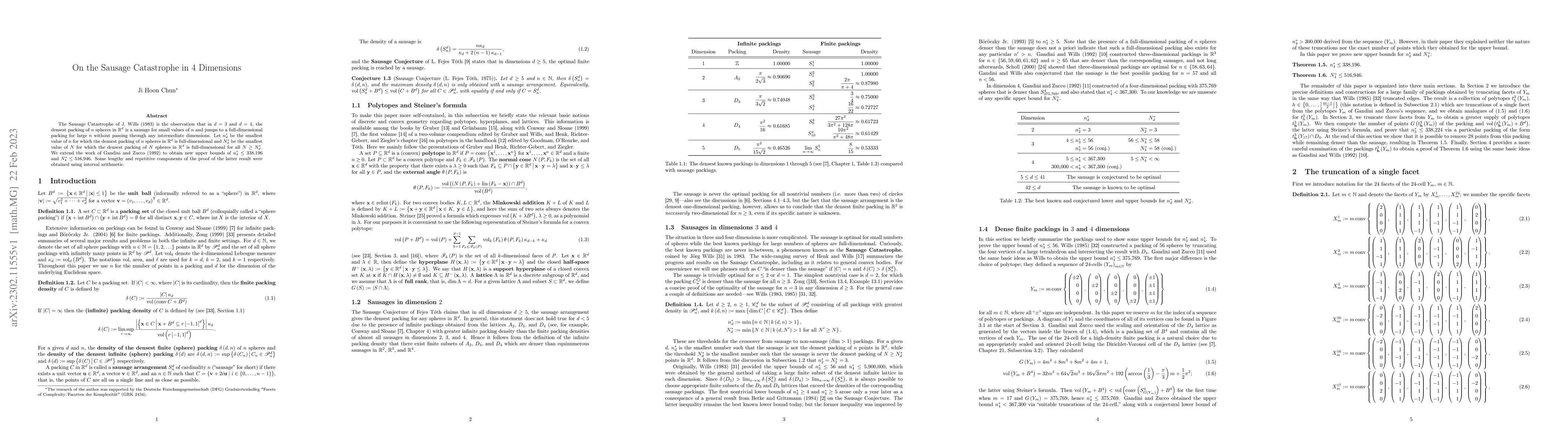 This paper investigates the Sausage Catastrophe in 4 dimensions, finding that densest sphere packing transitions directly from sausage to full-dimensional packing without intermediate states. New upper bounds of $n_{4}^{*}\leq338,\!196$ and $N_{4}^{*}\leq516,\!946$ are established, with some proof components relying on interval arithmetic.