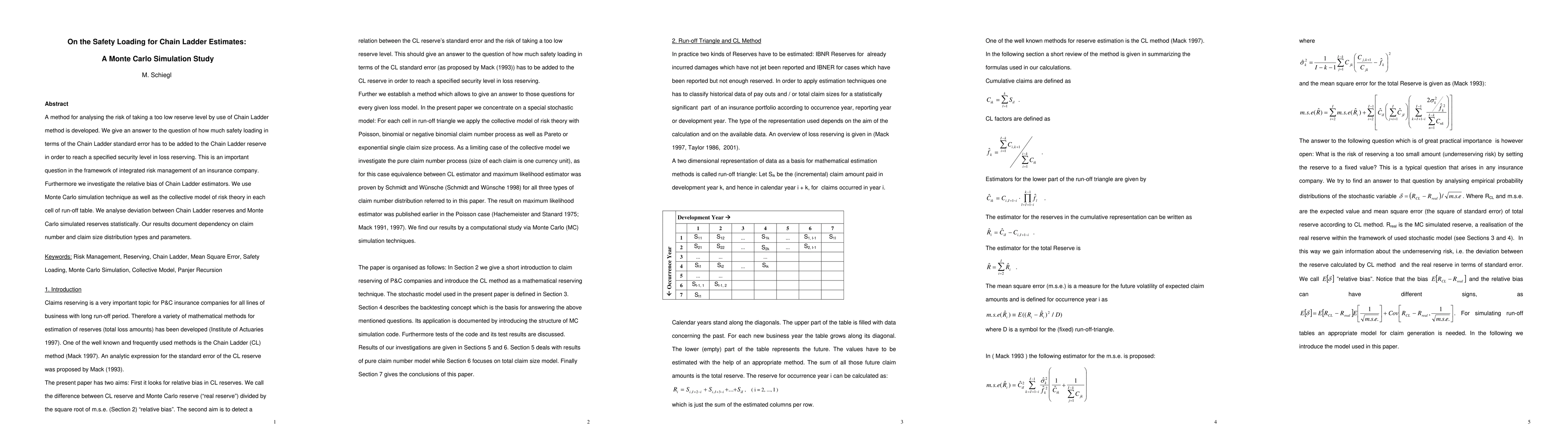 A method for analysing the risk of taking a too low reserve level by use of Chain Ladder method is developed. We give an answer to the question of how much safety loading in terms of the Chain Ladder standard error has to be added to the Chain Ladder reserve in order to reach a specified security level in loss reserving. This is an important question in the framework of integrated risk management of an insurance company. Furthermore we investigate the relative bias of Chain Ladder estimators. We use Monte Carlo simulation technique as well as the collective model of risk theory in each cell of run-off table. We analyse deviation between Chain Ladder reserves and Monte Carlo simulated reserves statistically. Our results document dependency on claim number and claim size distribution types and parameters.