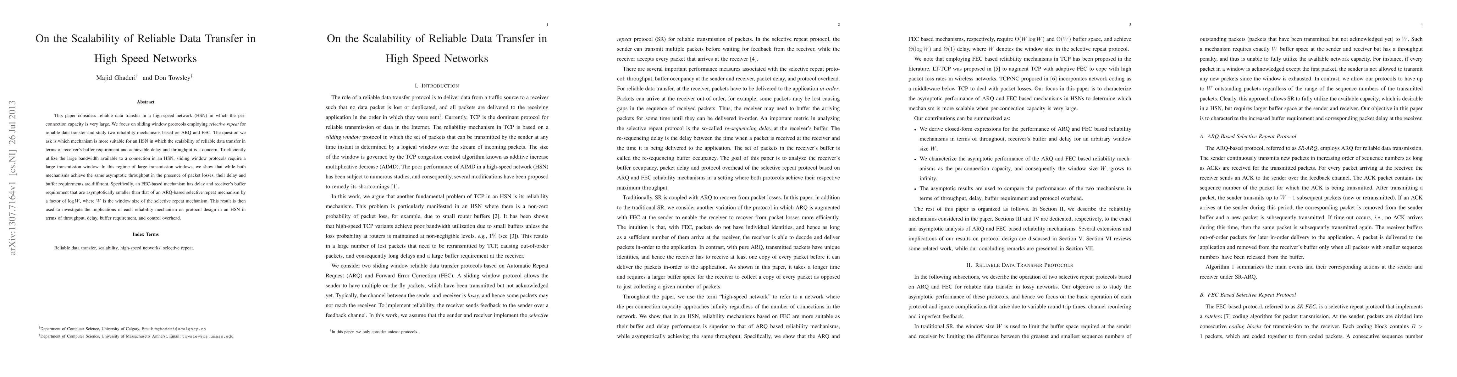 This paper considers reliable data transfer in a high-speed network (HSN) in which the per-connection capacity is very large. We focus on sliding window protocols employing selective repeat for reliable data transfer and study two reliability mechanisms based on ARQ and FEC. The question we ask is which mechanism is more suitable for an HSN in which the scalability of reliable data transfer in terms of receiver's buffer requirement and achievable delay and throughput is a concern. To efficiently utilize the large bandwidth available to a connection in an HSN, sliding window protocols require a large transmission window. In this regime of large transmission windows, we show that while both mechanisms achieve the same asymptotic throughput in the presence of packet losses, their delay and buffer requirements are different. Specifically, an FEC-based mechanism has delay and receiver's buffer requirement that are asymptotically smaller than that of an ARQ-based selective repeat mechanism by a factor of log W, where W is the window size of the selective repeat mechanism. This result is then used to investigate the implications of each reliability mechanism on protocol design in an HSN in terms of throughput, delay, buffer requirement, and control overhead.