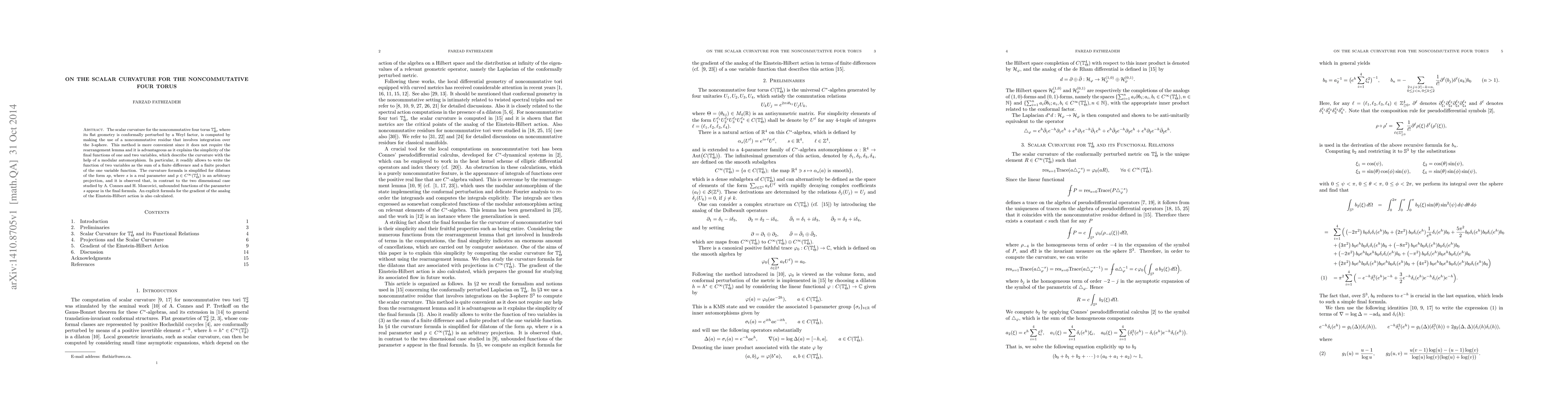 The scalar curvature for the noncommutative four torus $\mathbb{T}_\Theta^4$, where its flat geometry is conformally perturbed by a Weyl factor, is computed by making the use of a noncommutative residue that involves integration over the 3-sphere. This method is more convenient since it does not require the rearrangement lemma and it is advantageous as it explains the simplicity of the final functions of one and two variables, which describe the curvature with the help of a modular automorphism. In particular, it readily allows to write the function of two variables as the sum of a finite difference and a finite product of the one variable function. The curvature formula is simplified for dilatons of the form $sp$, where $s $ is a real parameter and $p \in C^\infty(\mathbb{T}_\Theta^4)$ is an arbitrary projection, and it is observed that, in contrast to the two dimensional case studied by A. Connes and H. Moscovici, unbounded functions of the parameter $s$ appear in the final formula. An explicit formula for the gradient of the analog of the Einstein-Hilbert action is also calculated.