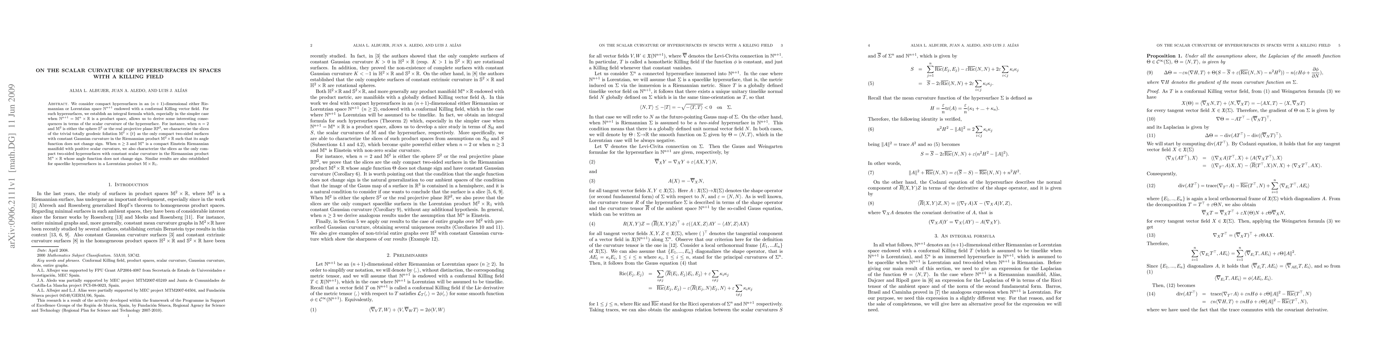 We consider compact hypersurfaces in an $(n+1)$-dimensional either Riemannian or Lorentzian space $N^{n+1}$ endowed with a conformal Killing vector field. For such hypersurfaces, we establish an integral formula which, especially in the simpler case when $N=M^n\times R$ is a product space, allows us to derive some interesting consequences in terms of the scalar curvature of the hypersurface. For instance, when $n=2$ and $M^2$ is either the sphere $\mathbb{S}^2$ or the real projective plane $\mathbb{RP}^2$, we characterize the slices of the trivial totally geodesic foliation $M^2\times\{t\}$ as the only compact two-sided surfaces with constant Gaussian curvature in the Riemannian product $M^2\times\mathbb{R}$ such that its angle function does not change sign. When $n\geq 3$ and $M^n$ is a compact Einstein Riemannian manifold with positive scalar curvature, we also characterize the slices as the only compact two-sided hypersurfaces with constant scalar curvature in the Riemannian product $M^n\times\mathbb{R}$ whose angle function does not change sign. Similar results are also established for spacelike hypersurfaces in a Lorentzian product $\mathbb{M}\times\mathbb{R}_1$.