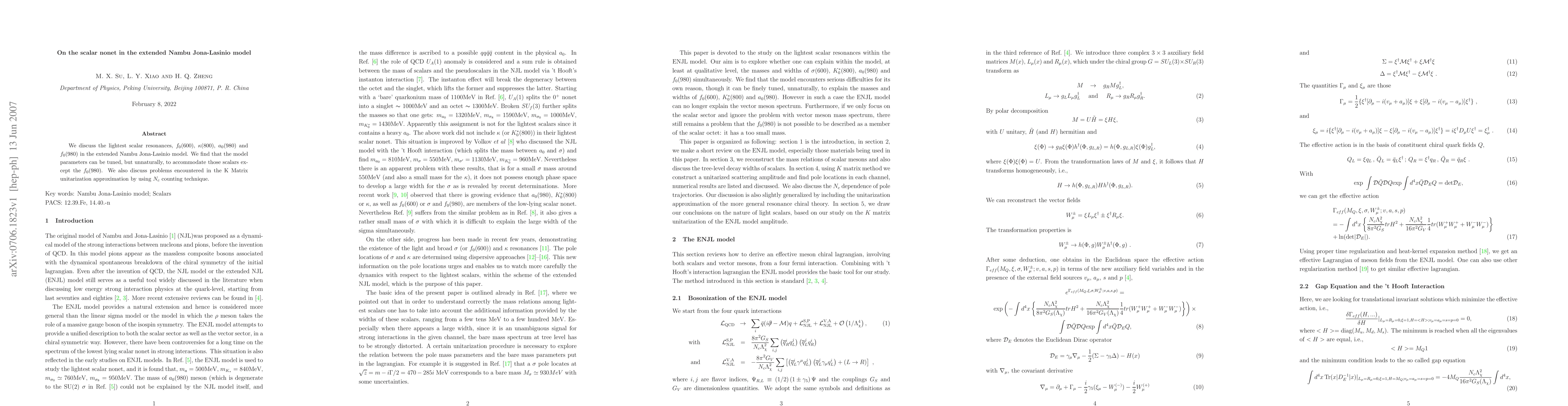 This paper explores the lightest scalar resonances in the extended Nambu Jona-Lasinio model, finding that while the model can be adjusted to fit $f_0(600)$, $\kappa(800)$, and $a_0(980)$, it fails for $f_0(980)$. It also highlights issues with the K Matrix unitarization approximation using the $N_c$ counting technique.