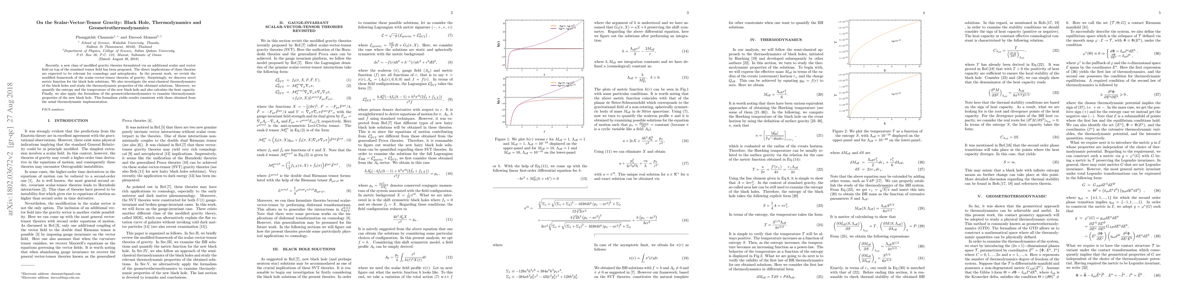 This paper revisits scalar-vector-tensor gravity theories, discovering novel black hole metric functions and exploring their thermodynamic properties, including entropy, temperature, and heat capacity, while also applying geometrothermodynamics for consistency.