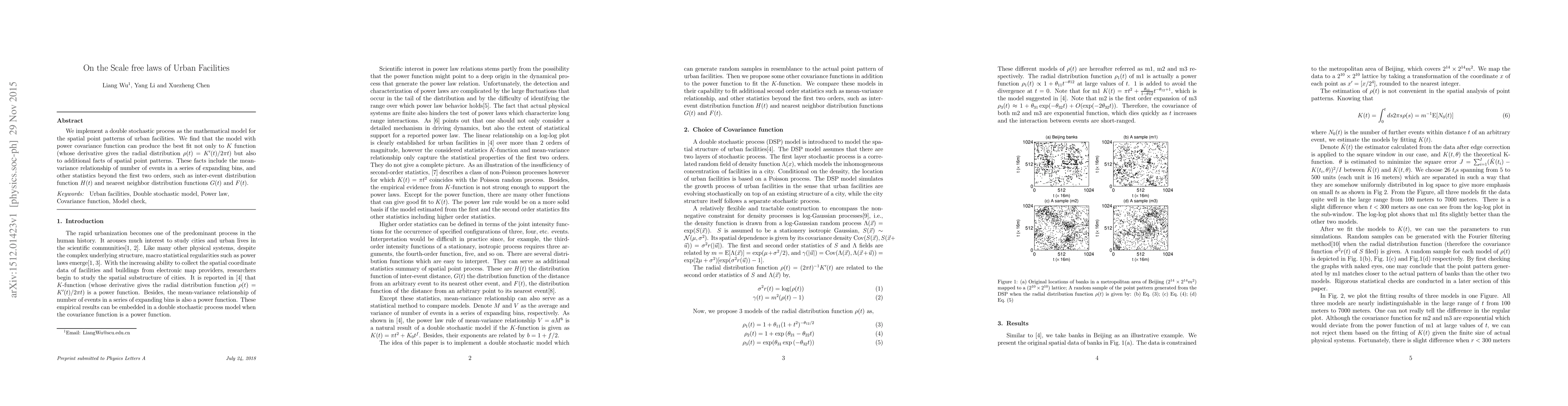 We implement a double stochastic process as the mathematical model for the spatial point patterns of urban facilities. We find that the model with power covariance function can produce the best fit not only to $K$ function (whose derivative gives the radial distribution $\rho(t) = K'(t)/2\pi t$) but also to additional facts of spatial point patterns. These facts include the mean-variance relationship of number of events in a series of expanding bins, and other statistics beyond the first two orders, such as inter-event distribution function $H(t)$ and nearest neighbor distribution functions $G(t)$ and $F(t)$.