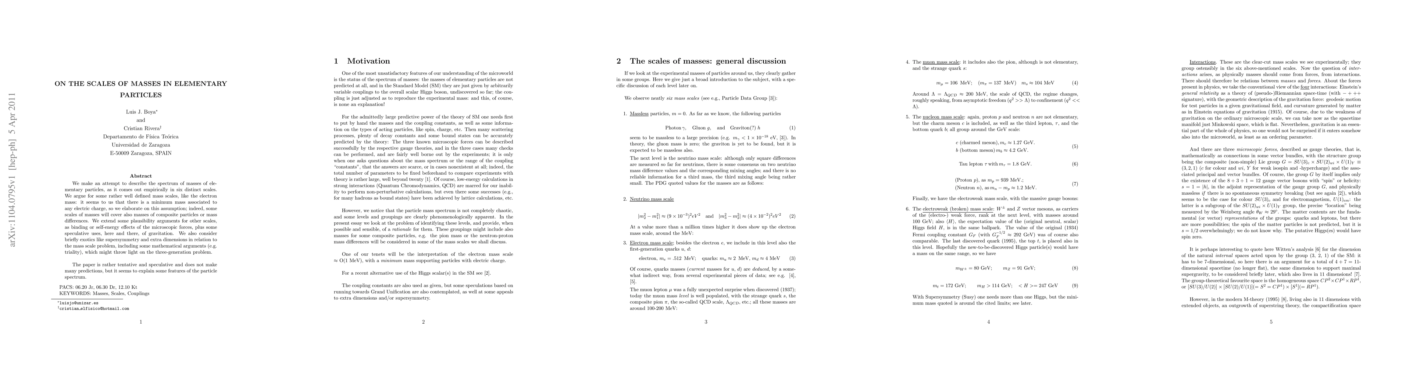 This paper explores six distinct scales in the mass spectrum of elementary particles, proposing a minimum mass for any electric charge and considering binding and self-energy effects, as well as speculative gravitational influences. It also briefly touches on supersymmetry and extra dimensions, offering mathematical insights into the three-generation problem.