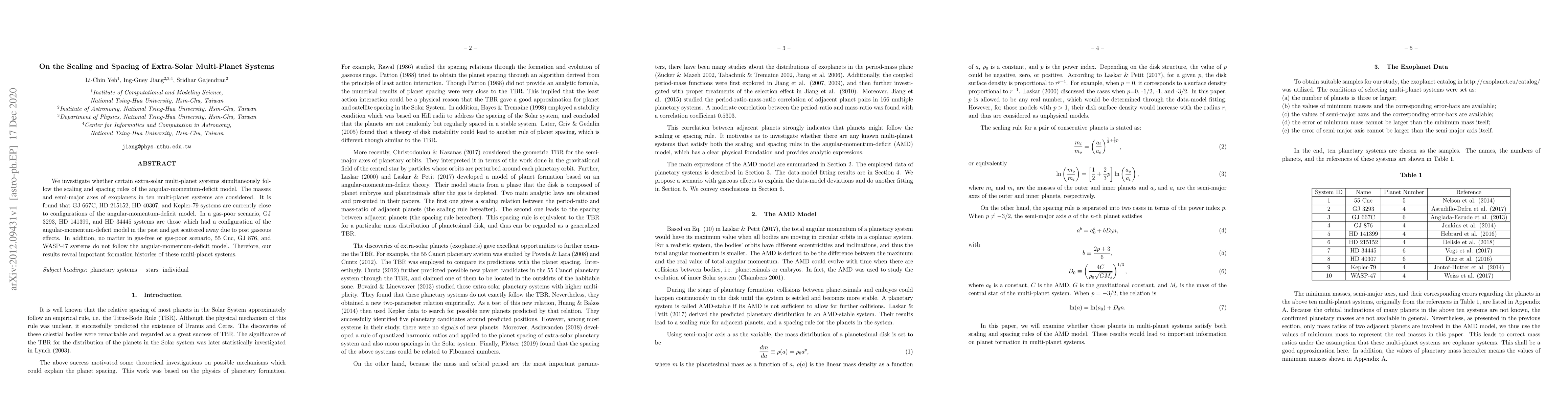 We investigate whether certain extra-solar multi-planet systems simultaneously follow the scaling and spacing rules of the angular-momentum-deficit model. The masses and semi-major axes of exoplanets in ten multi-planet systems are considered. It is found that GJ 667C, HD 215152, HD 40307, and Kepler-79 systems are currently close to configurations of the angular-momentum-deficit model. In a gas-poor scenario, GJ 3293, HD 141399, and HD 34445 systems are those which had a configuration of the angular-momentum-deficit model in the past and get scattered away due to post gaseous effects. In addition, no matter in gas-free or gas-poor scenario, 55 Cnc, GJ 876, and WASP-47 systems do not follow the angular-momentum-deficit model. Therefore, our results reveal important formation histories of these multi-planet systems.
