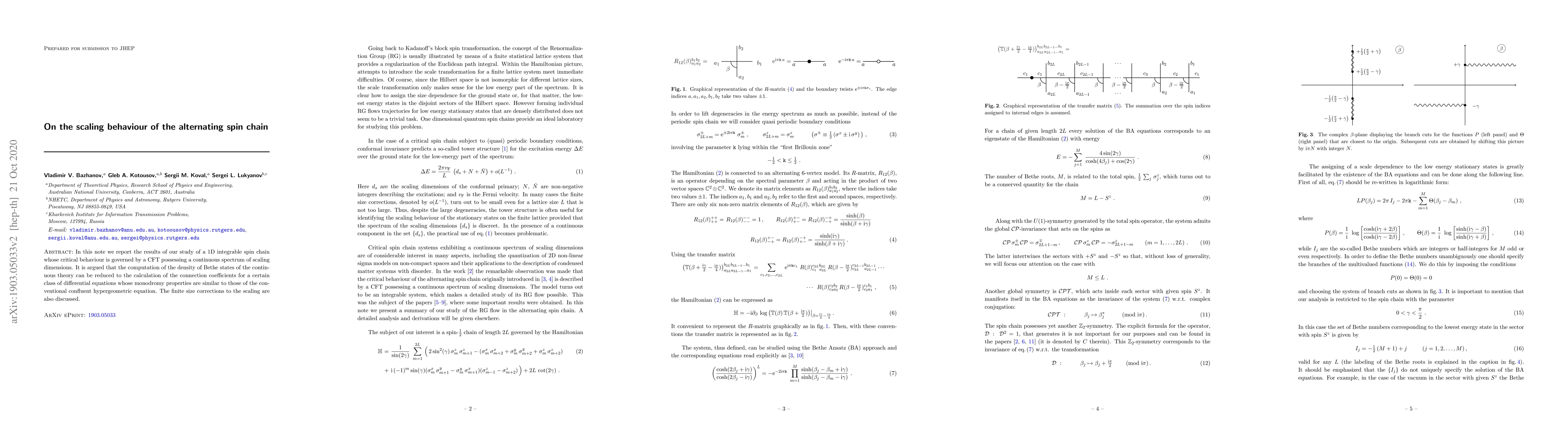 In this note we report the results of our study of a 1D integrable spin chain whose critical behaviour is governed by a CFT possessing a continuous spectrum of scaling dimensions. It is argued that the computation of the density of Bethe states of the continuous theory can be reduced to the calculation of the connection coefficients for a certain class of differential equations whose monodromy properties are similar to those of the conventional confluent hypergeometric equation. The finite size corrections to the scaling are also discussed.