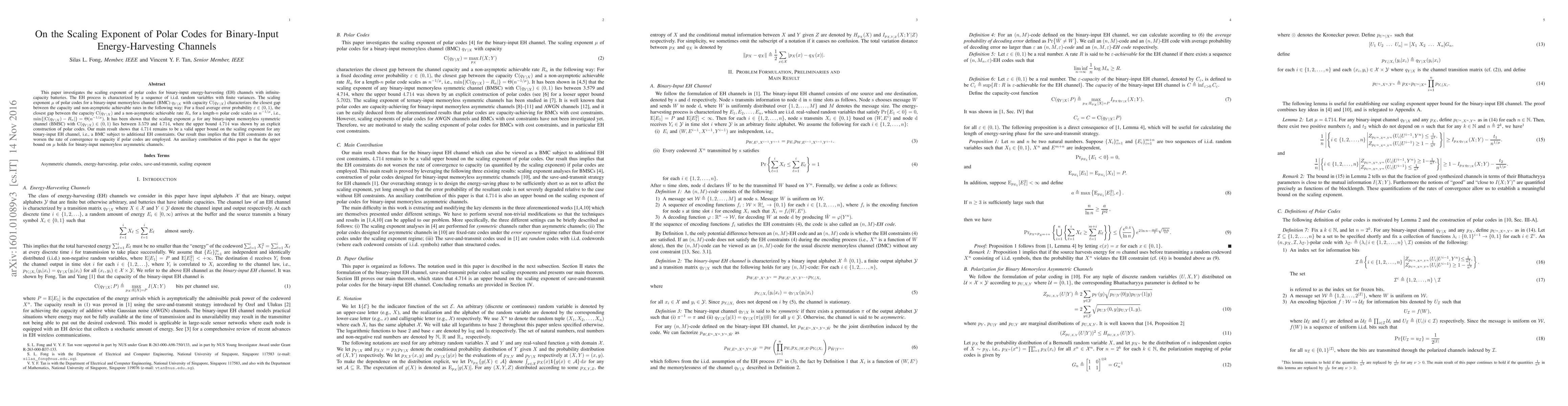 This paper establishes that the scaling exponent for polar codes remains at an upper bound of 4.714 for binary-input energy-harvesting channels, indicating that energy-harvesting constraints do not degrade the rate of convergence to capacity. The result leverages prior analyses of binary-input memoryless symmetric channels and the use of polar codes for asymmetric channels.